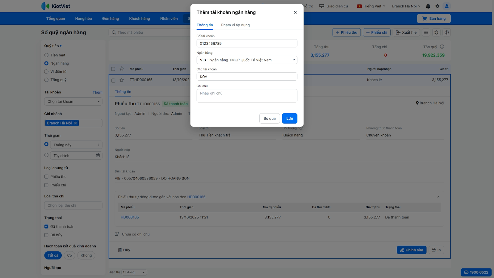 - Tình huống: Để màn hình có thể tạo mã QR với đúng thông tin của cửa hàng, trước tiên bạn cần khai báo tài khoản ngân hàng sẽ nhận tiền trên phần mềm KiotViet.