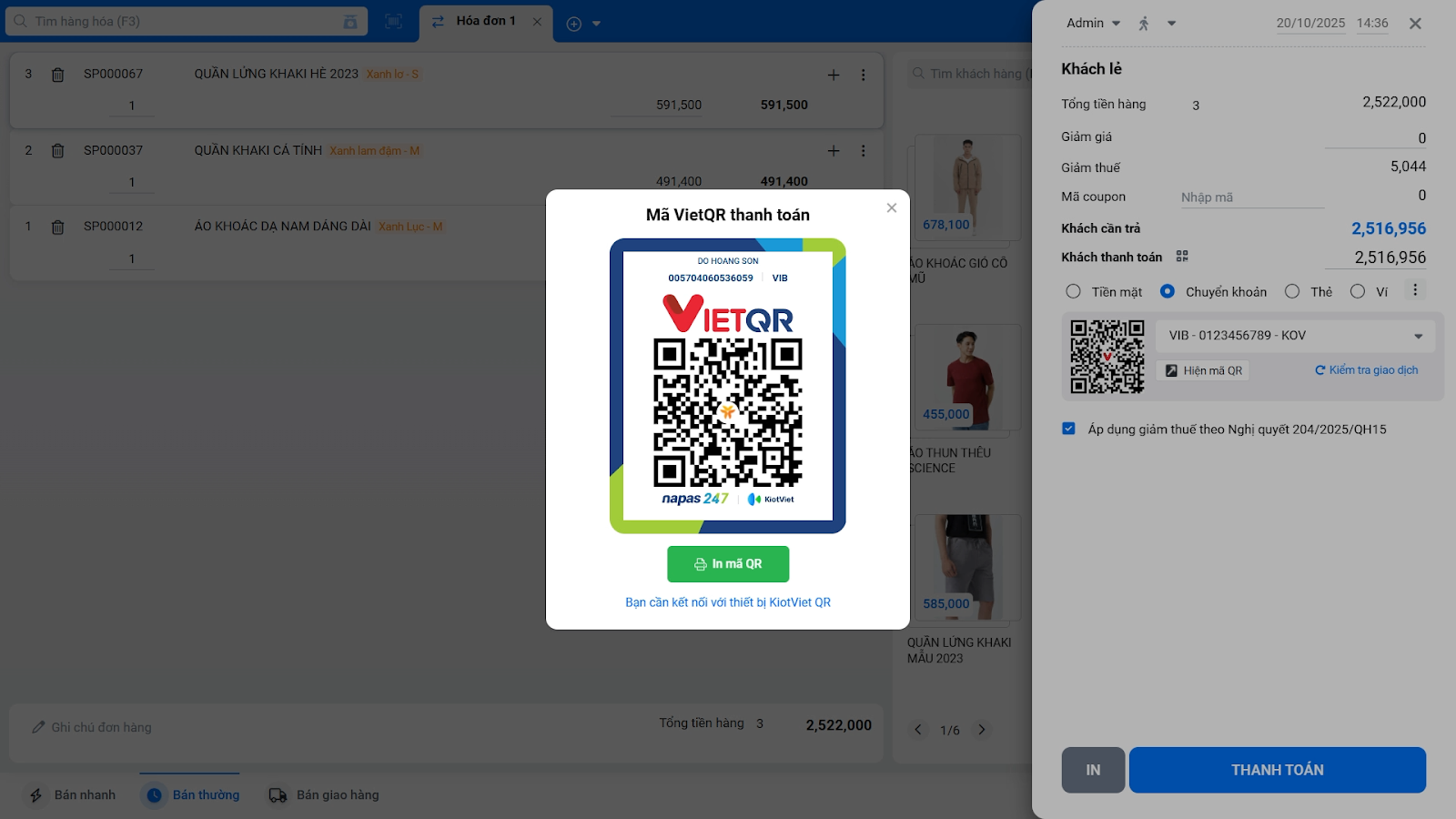 - Khi bán hàng và chọn hình thức thanh toán là Chuyển khoản, ứng dụng sẽ tự động đẩy mã QR ra màn hình phụ để khách hàng thực hiện thanh toán.
