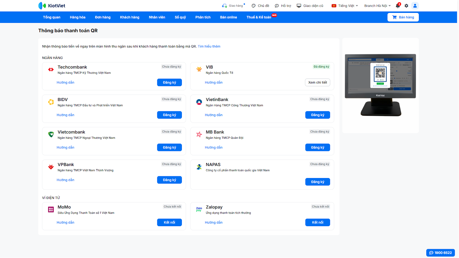 - Để sử dụng, bạn cần kích hoạt tính năng này. Vui lòng tham khảo hướng dẫn chi tiết tại website Hỗ trợ KiotViet, mục “Thanh toán”.