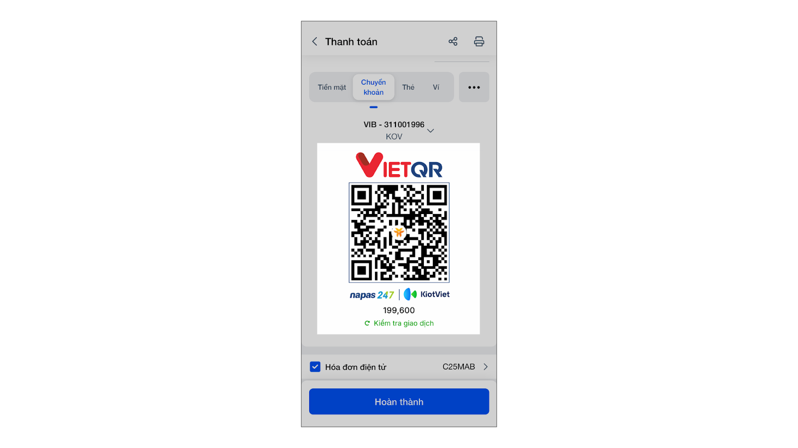 - Tính năng: Hiển thị mã QR động, bao gồm thông tin tài khoản và chính xác số tiền của hóa đơn.