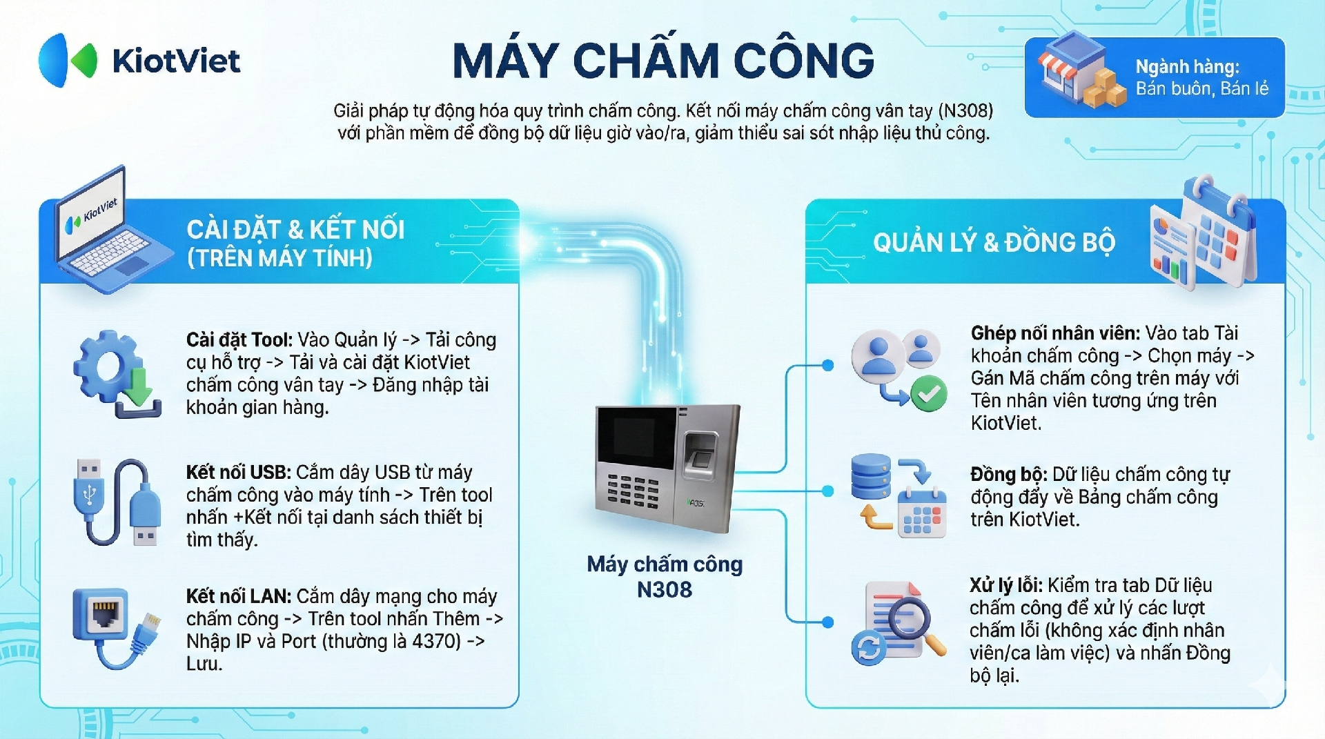 - Kết nối đồng bộ dữ liệu chấm công từ máy chấm công đến bảng chấm công của cửa hàng