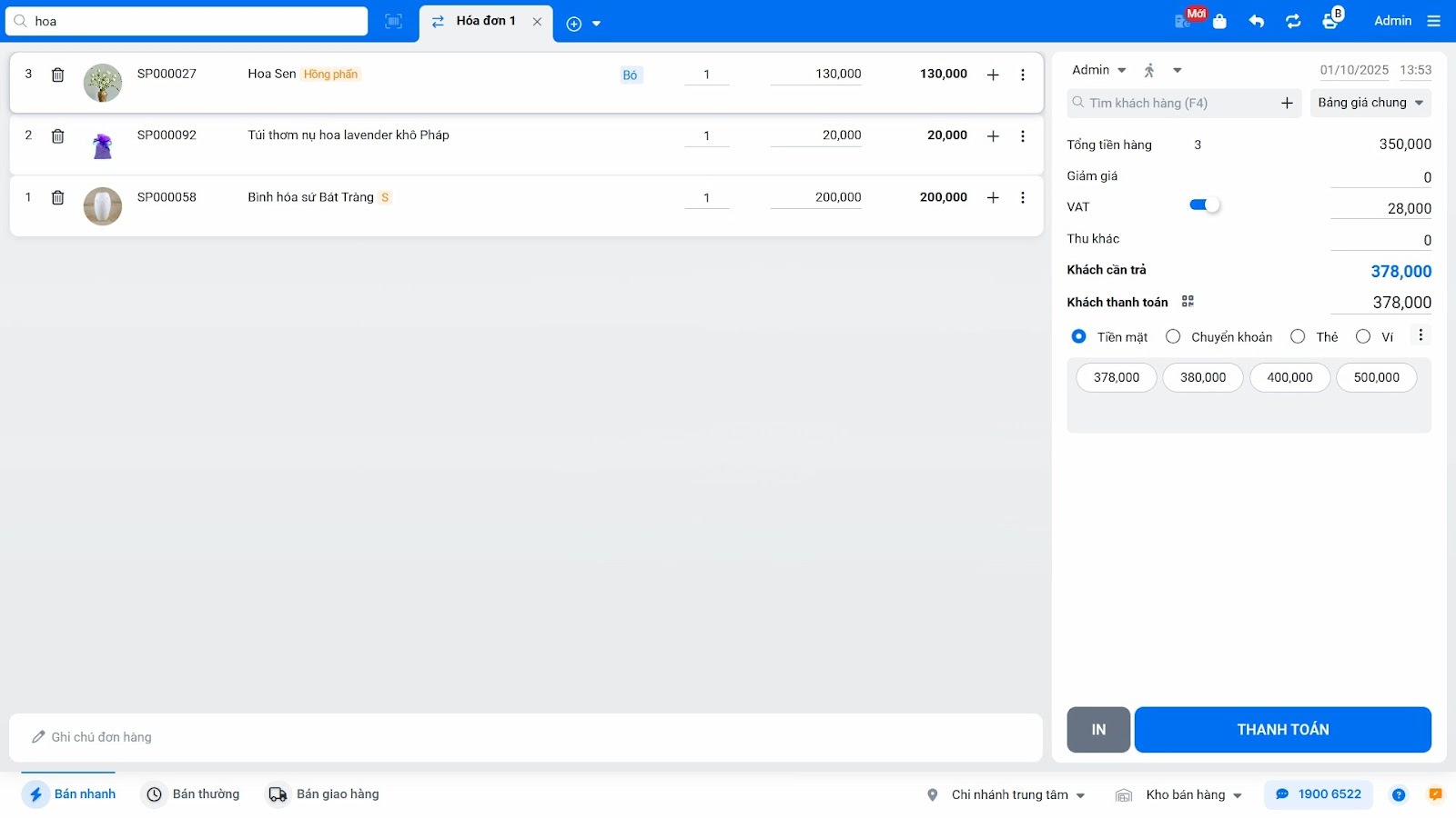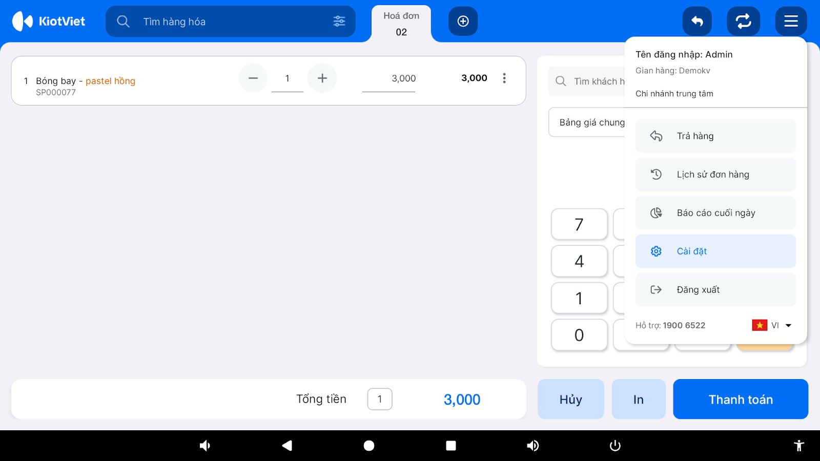 - Trên màn hình bán hàng KiotViet, thêm sản phẩm và nhấn Thanh toán.