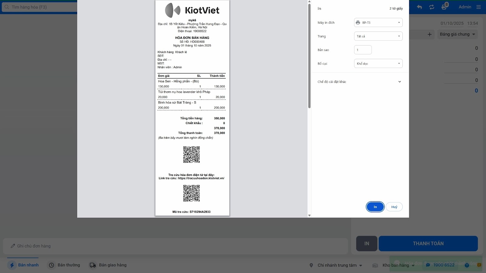- Nhấn In (Print). Hóa đơn sẽ được in ra thành công.