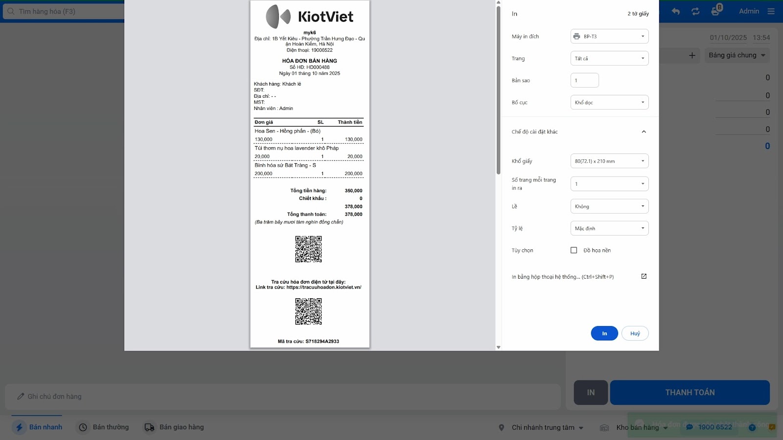 - Tình huống: Sau khi cài đặt thành công, bạn cần thực hiện in thử một hóa đơn thực tế và cấu hình để tiết kiệm giấy in.