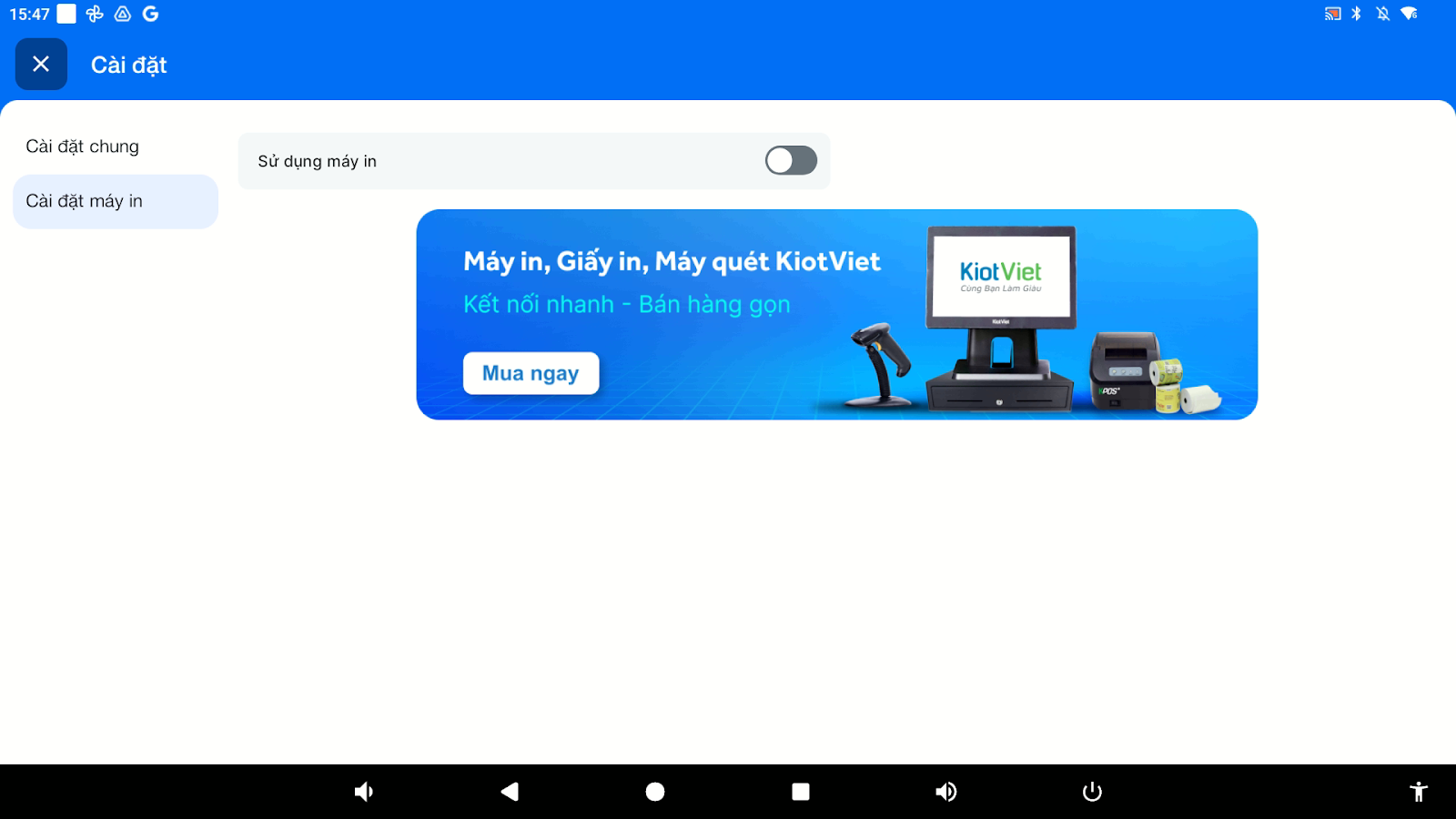 - Vào menu -> Cài đặt → Cài đặt máy in → Bật Sử dụng máy in.