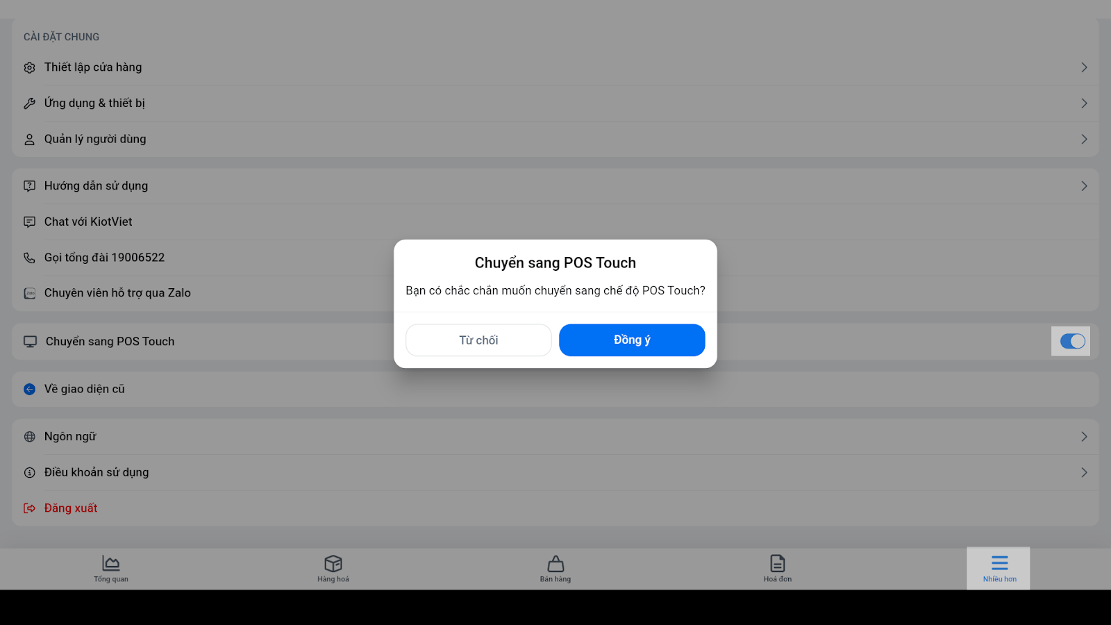 - Để tối ưu hiển thị cho máy POS bán hàng, sau khi đăng nhập thành công bạn chọn menu Nhiều hơn → bật Chuyển sang POS Touch → chọn Đồng ý xác nhận thông tin.