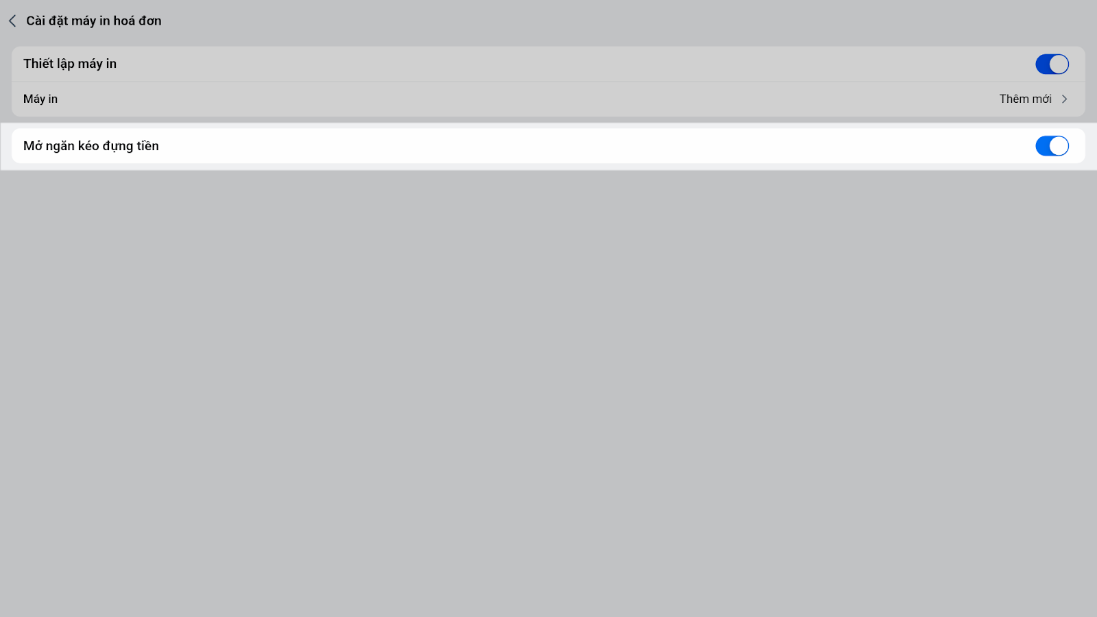 - Tại màn hình Cài máy in hóa đơn, bạn có thể bật tính năng Mở ngăn kéo đựng tiền → khi in hóa đơn từ ứng dụng quản lý bán hàng KiotViet trên máy POS → ngăn kéo sẽ tự động mở.