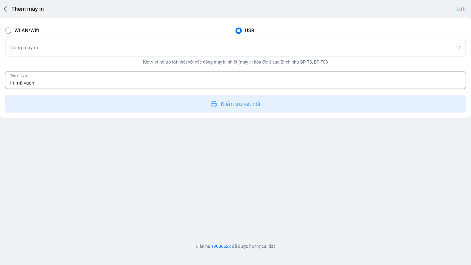 - Tùy vào kết nối Wi-Fi/LAN hay USB → ứng dụng sẽ dò tìm các máy in khả dụng. Bạn chọn đúng máy in muốn sử dụng và Lưu lại để hoàn tất.