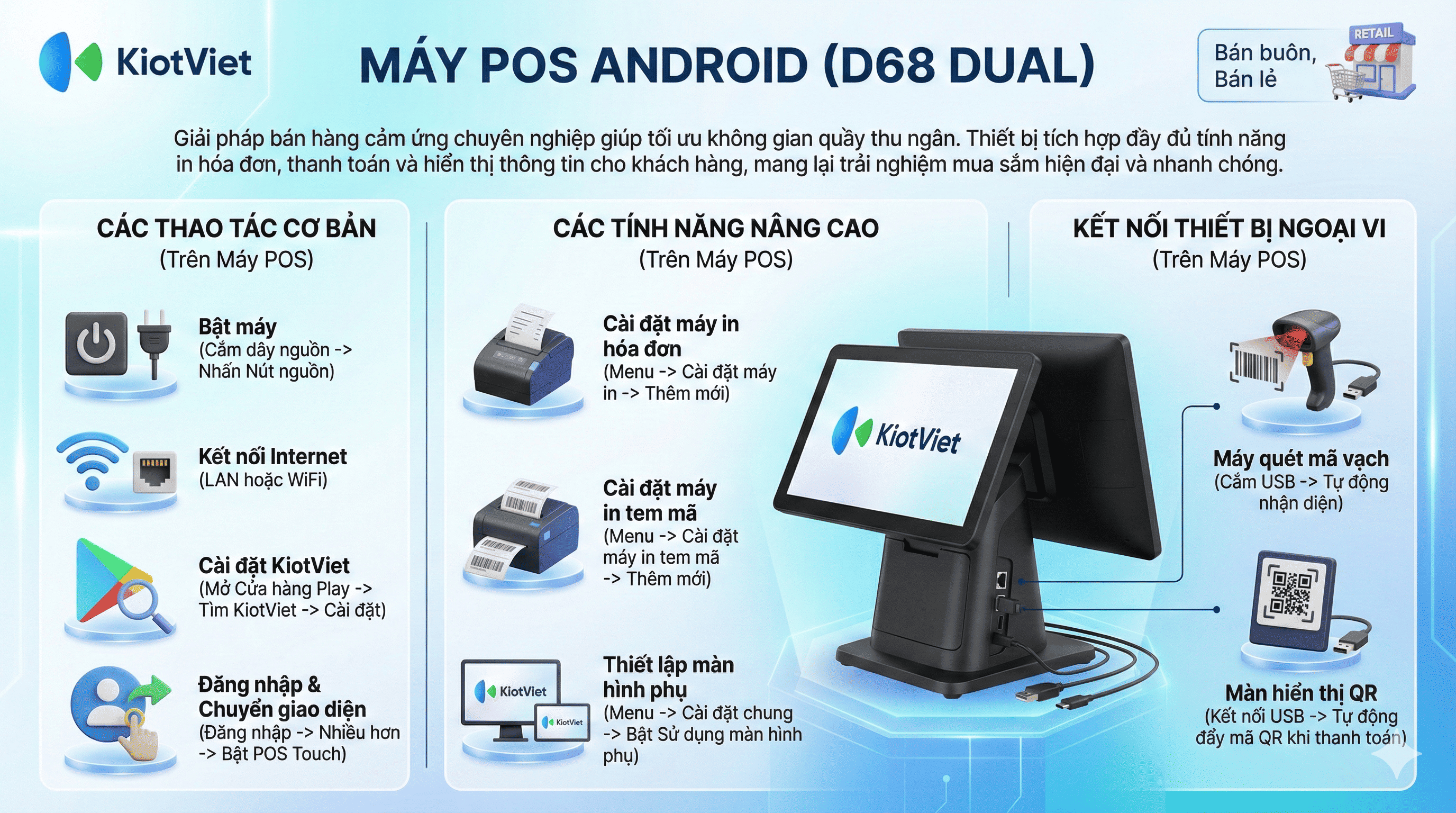 Trong bài viết này, KiotViet sẽ minh họa việc cài đặt và sử dụng với thiết bị D68 Dual. Bạn có thể thực hiện các thao tác cài đặt tương tự với các dòng máy POS Android khác từ KiotViet.