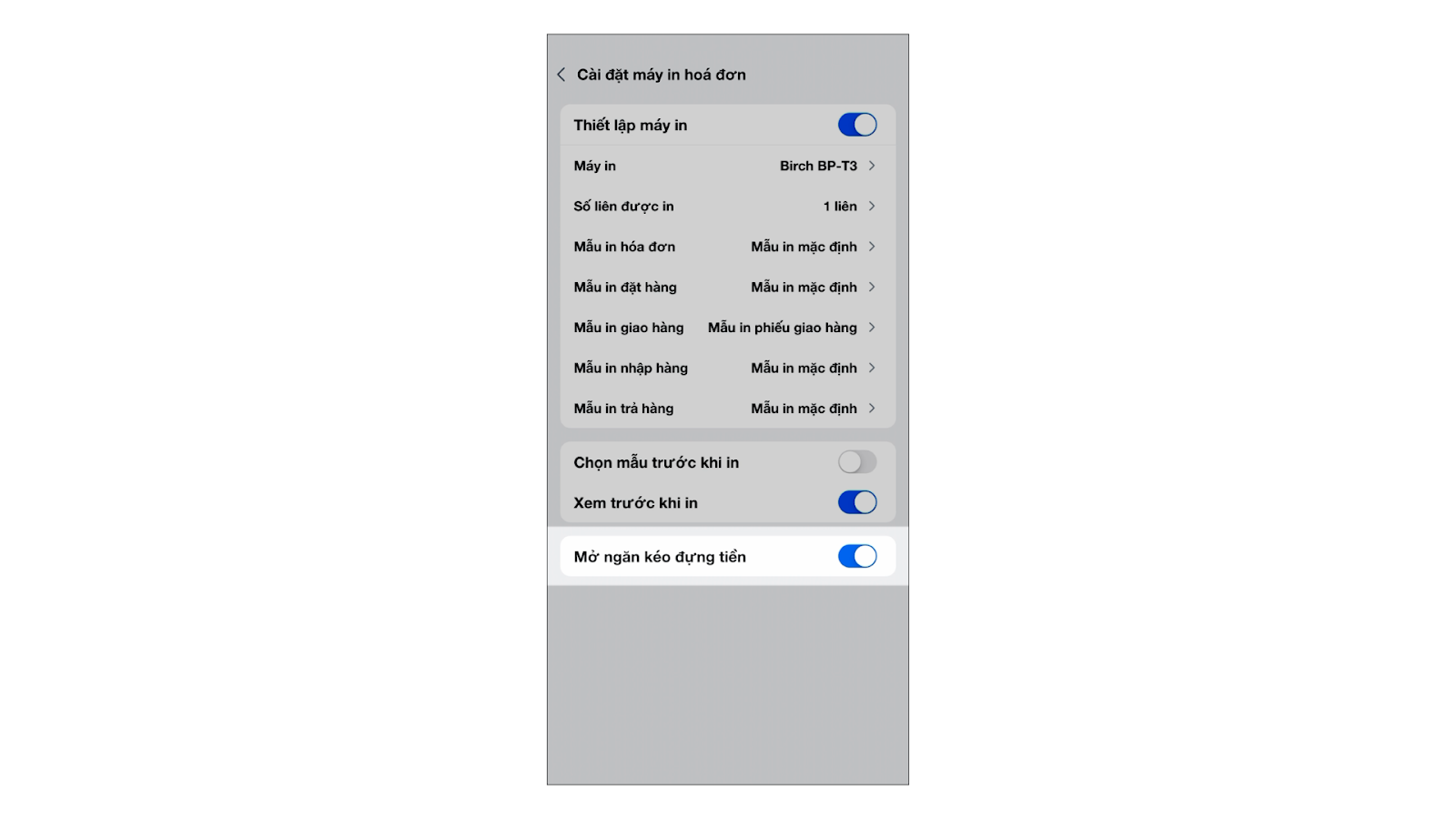 - Trong phần cấu hình của máy in đang kết nối, tìm và bật tùy chọn “Mở ngăn kéo đựng tiền”.