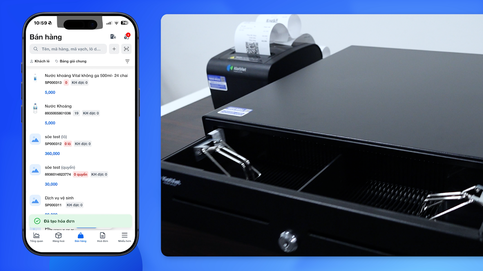 - Khi tạo đơn hàng trên điện thoại và in hóa đơn thành công, ngăn kéo đựng tiền sẽ tự động mở.