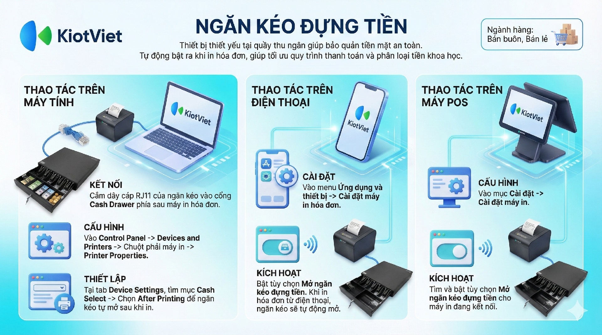 - Tình huống: Bạn muốn ngăn kéo đựng tiền tự động mở khi bạn in hóa đơn từ ứng dụng quản lý bán hàng KiotViet trên điện thoại.