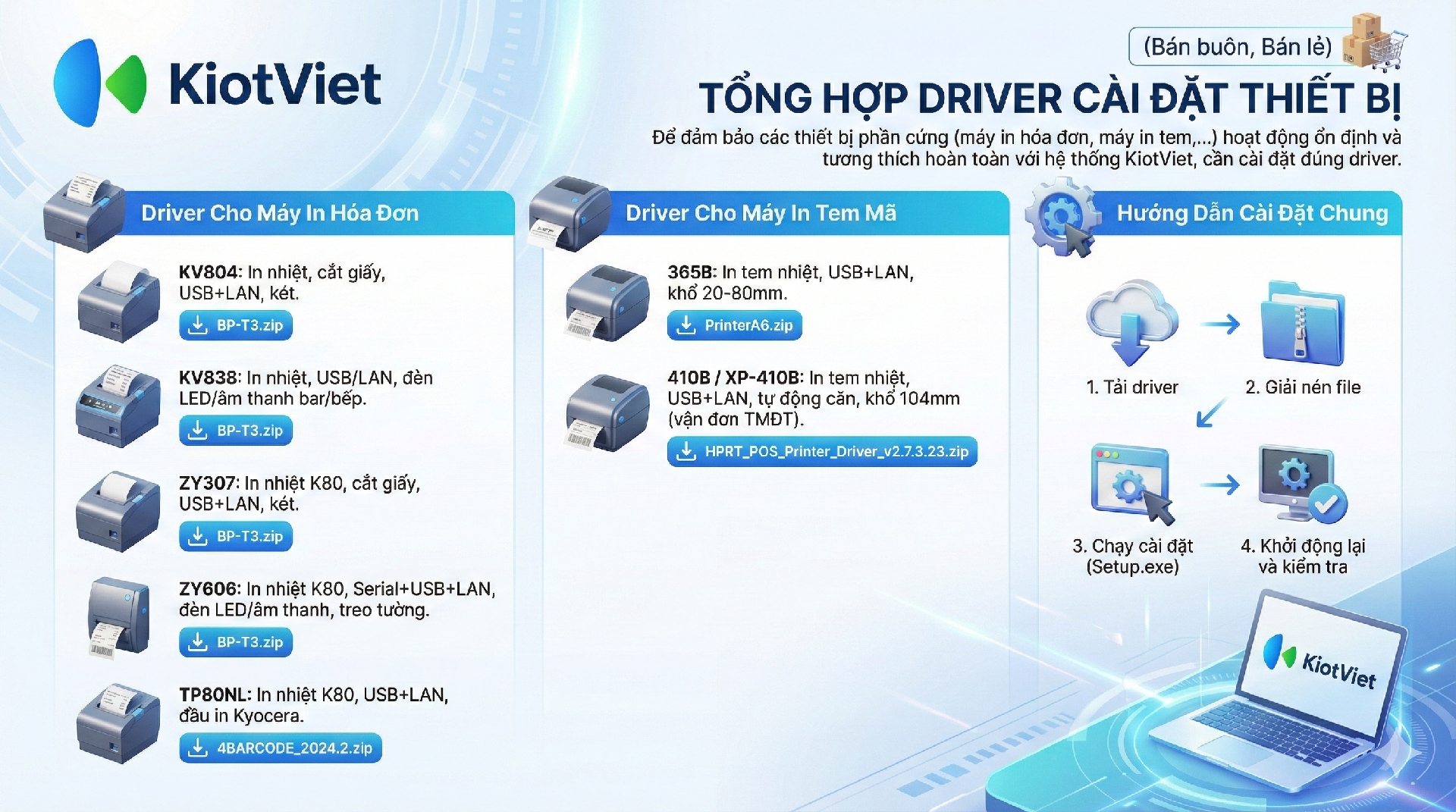 Để đảm bảo các thiết bị phần cứng (máy in hóa đơn, máy in tem,…) hoạt động ổn định và tương thích hoàn toàn với hệ thống KiotViet, bạn cần cài đặt đúng driver (trình điều khiển) cho từng loại thiết bị. Tài liệu này tổng hợp các driver cho những thiết bị phổ biến nhất và hướng dẫn quy trình cài đặt chung.