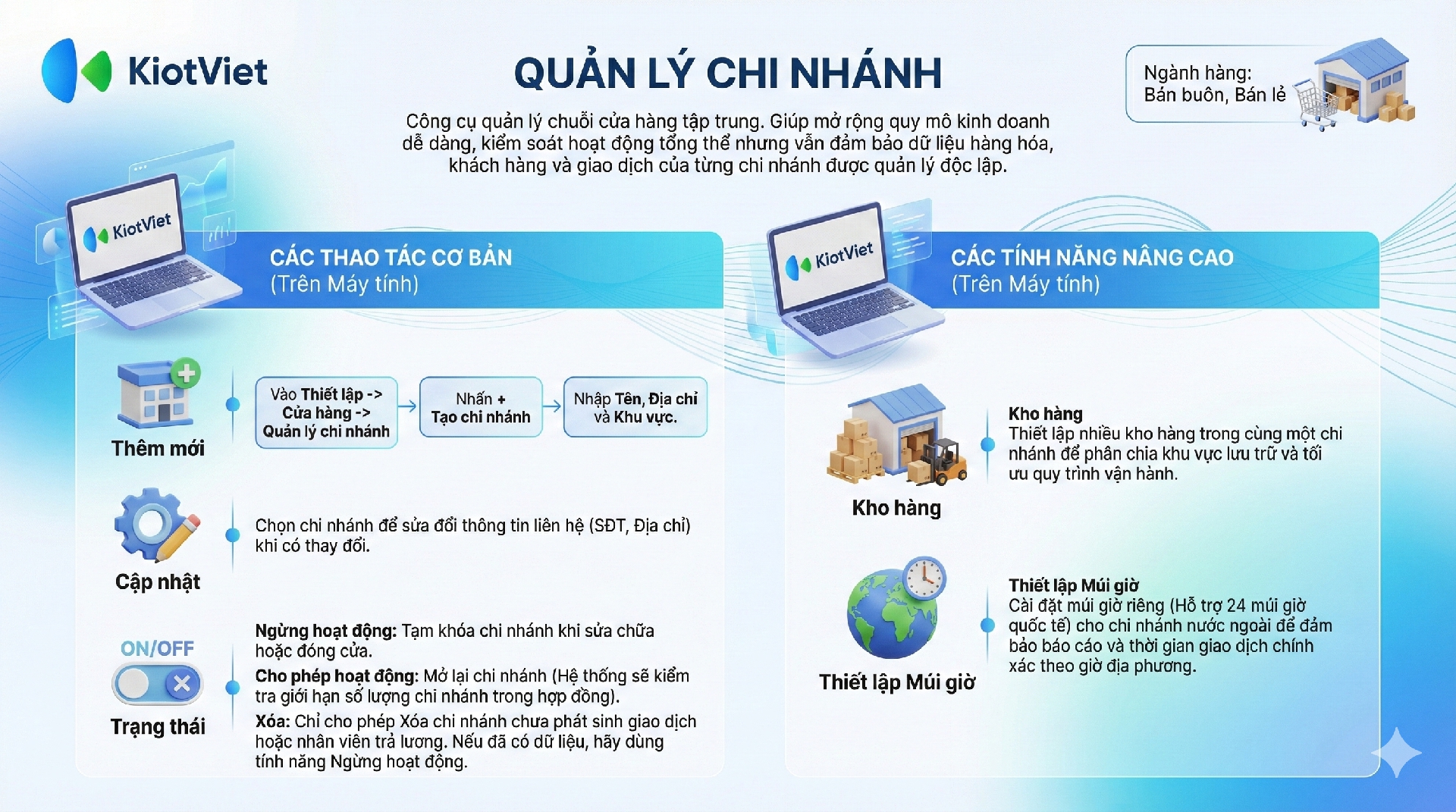 Tính năng Quản lý Chi nhánh là công cụ cốt lõi giúp bạn dễ dàng mở rộng quy mô kinh doanh và kiểm soát hoạt động của toàn bộ chuỗi cửa hàng một cách tập trung và hiệu quả.