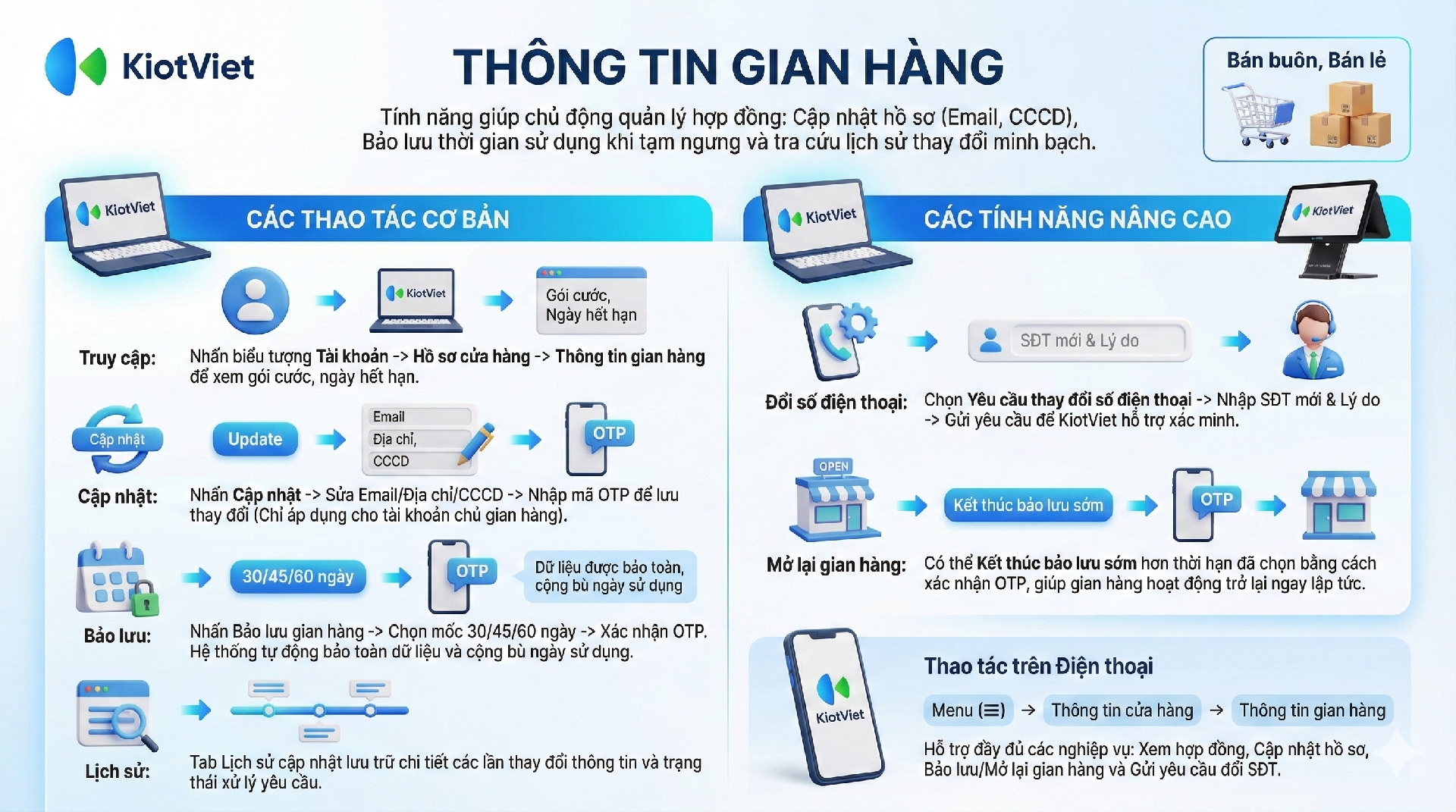 Tính năng này cho phép bạn chủ động xem và quản lý thông tin cá nhân/doanh nghiệp đã ký hợp đồng với KiotViet, bao gồm khả năng cập nhật thông tin hồ sơ, bảo lưu gian hàng khi tạm ngưng sử dụng, và theo dõi lịch sử các thay đổi.