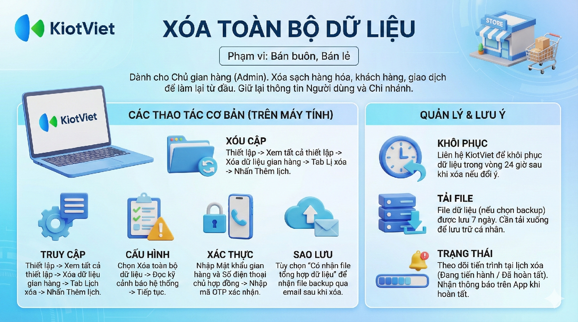 Nhằm đáp ứng nhu cầu làm lại dữ liệu gian hàng, không cần mất thời gian liên hệ hỗ trợ, KiotViet ra mắt tính năng Xóa toàn bộ dữ liệu giúp chủ gian hàng chủ động quản lý và xóa toàn bộ dữ liệu (ngoại trừ người dùng và chi nhánh) trực tiếp trên phần mềm
