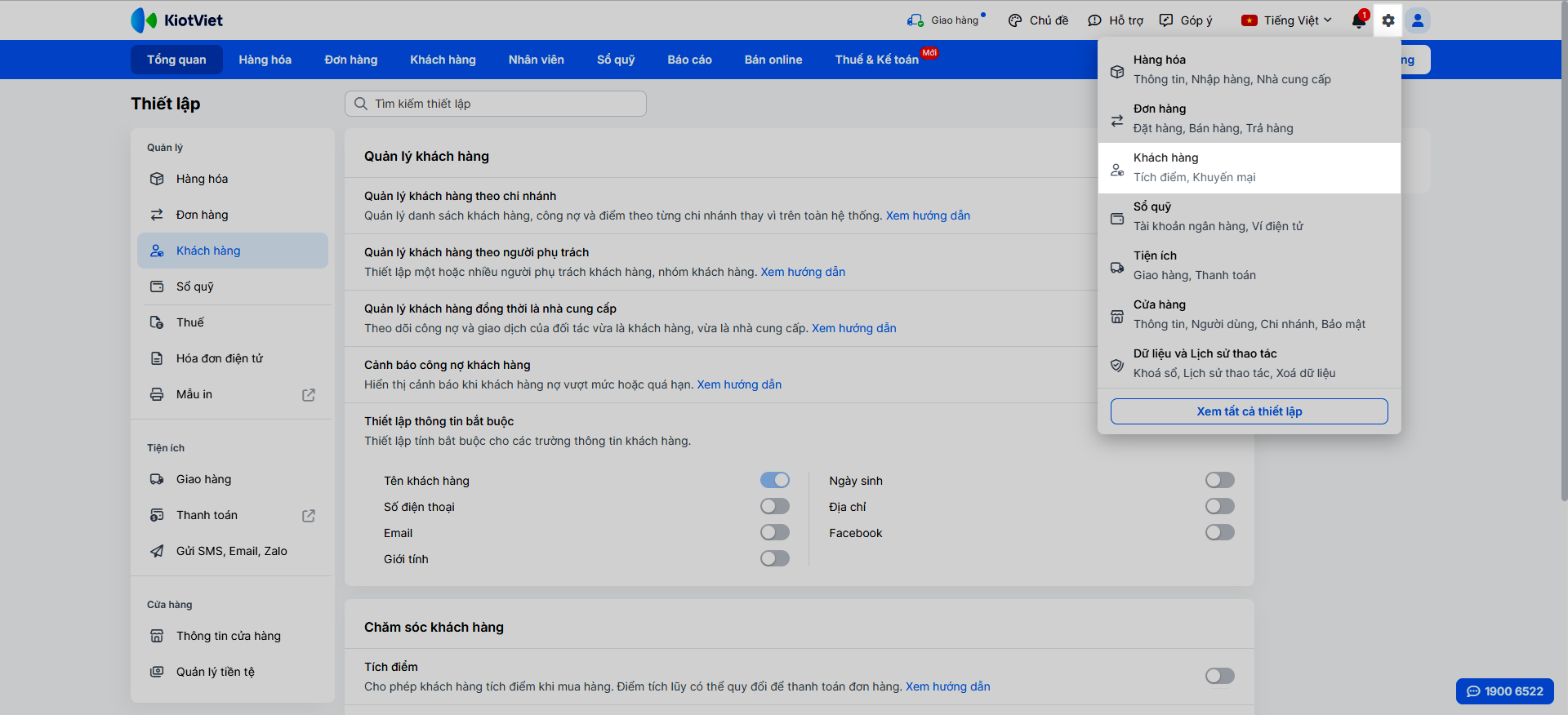 - Tại màn hình Quản lý, bạn vào menu Thiết lập → chọn Khách hàng
