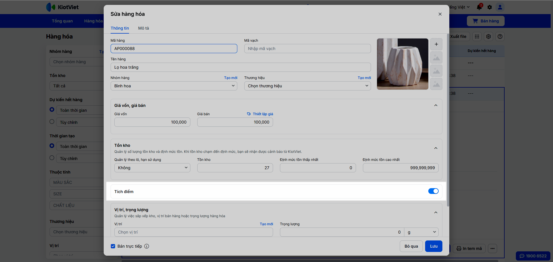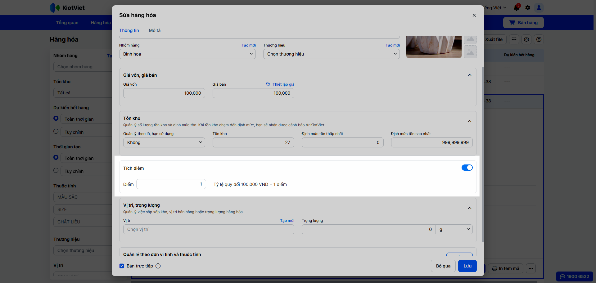 - Khi thêm mới/chỉnh sửa hàng hóa, bạn đánh dấu ô Tích điểm và nhập Điểm thưởng cụ thể cho sản phẩm đó.
