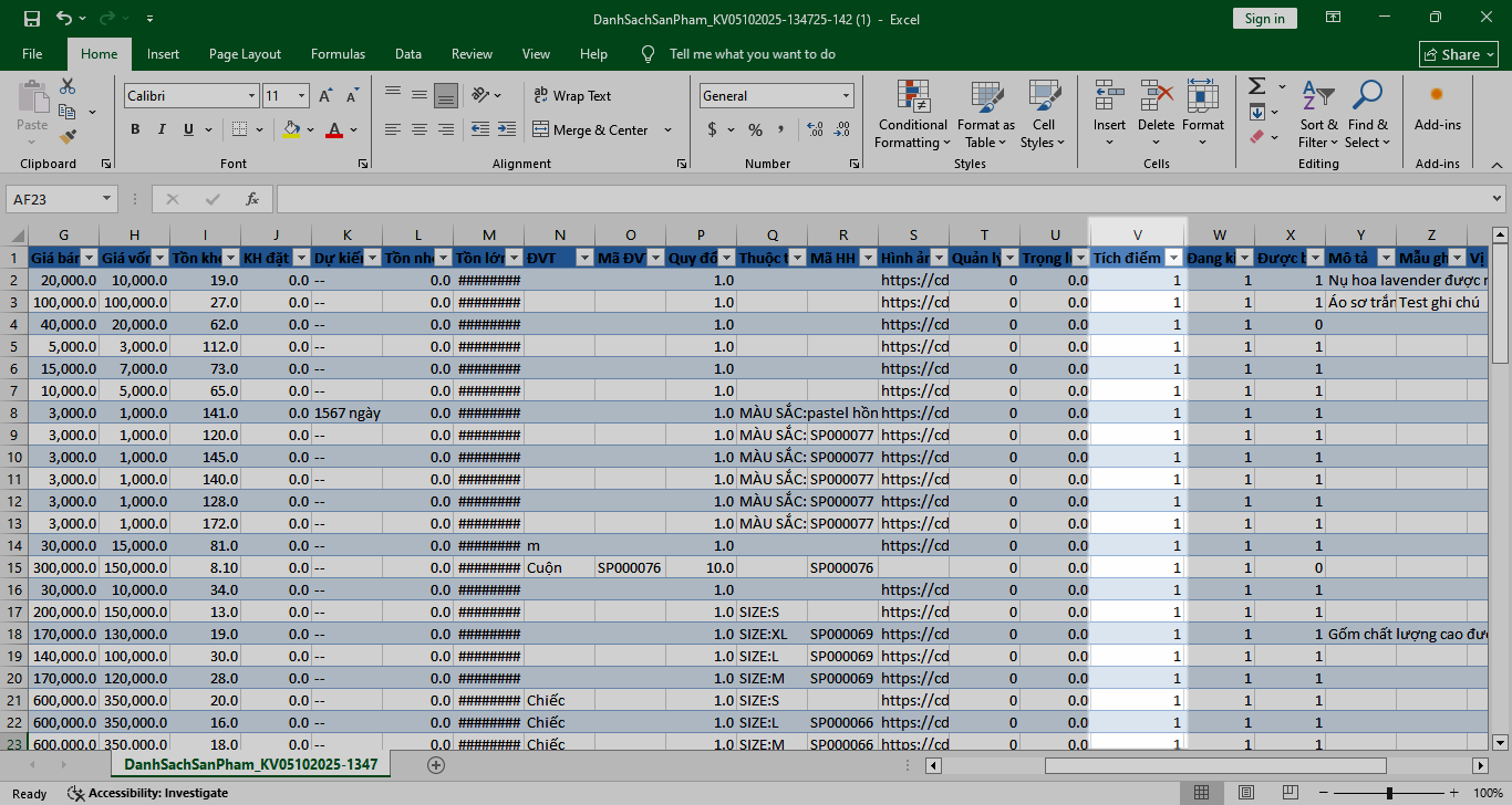 - Để cập nhật hàng loạt, bạn có thể sử dụng tính năng import file Excel, trong đó cột Tích điểm có giá trị là “1” cho các sản phẩm được áp dụng.