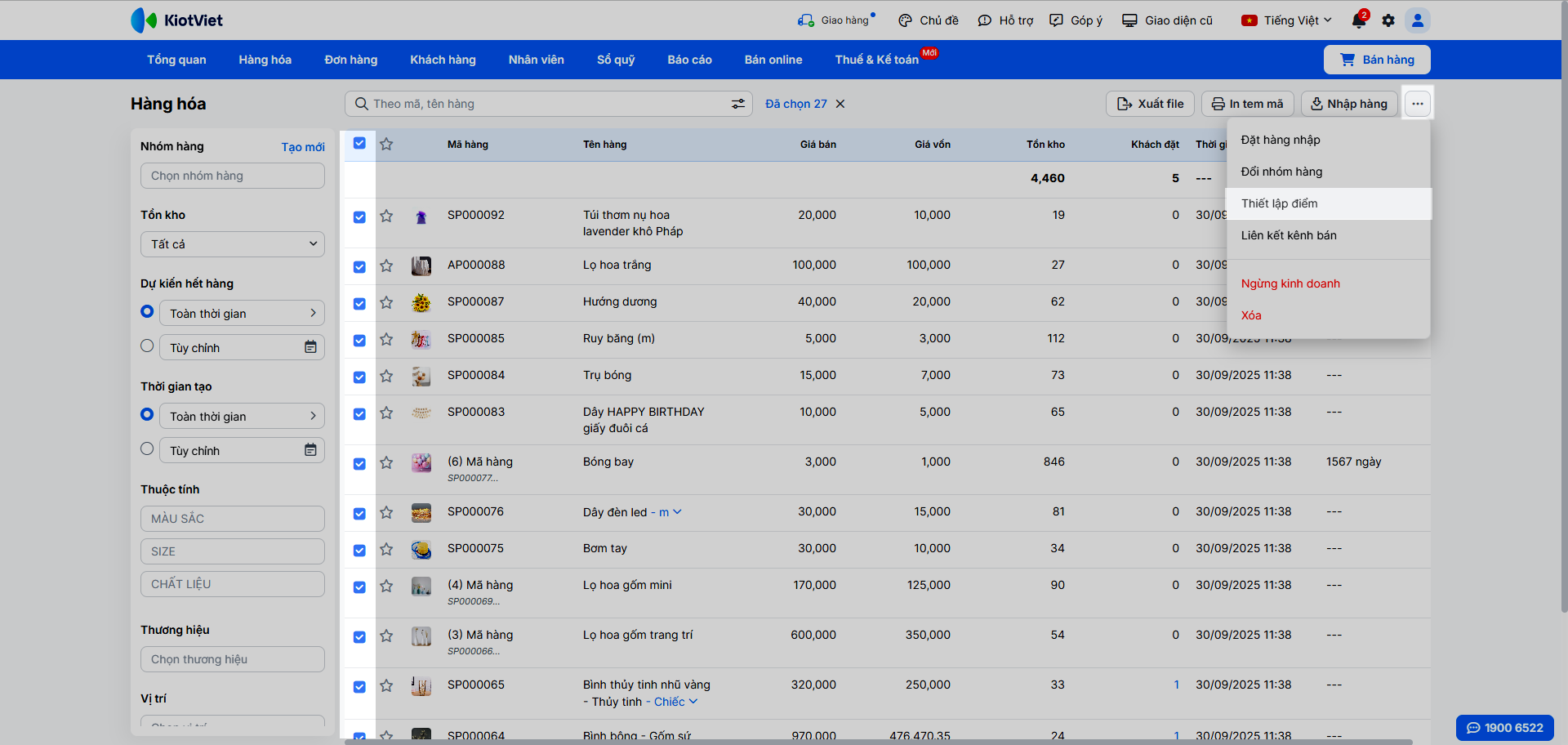 - Để thiết lập hàng loạt, tại màn hình Hàng hóa -> Danh sách hàng hóa, bạn chọn các sản phẩm cần thiết lập -> Thao tác -> Thiết lập điểm thưởng.