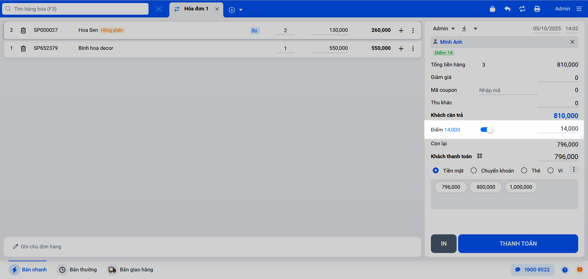 - Tại màn hình Bán hàng, bạn phải chọn thông tin khách hàng vào hóa đơn. Hệ thống sẽ hiển thị số điểm hiện có của khách.