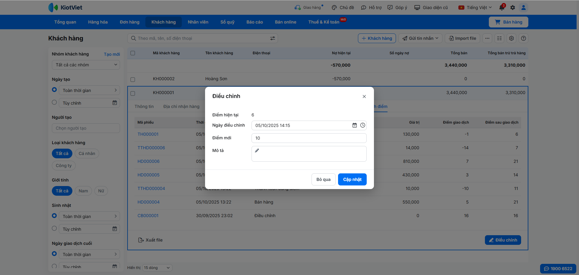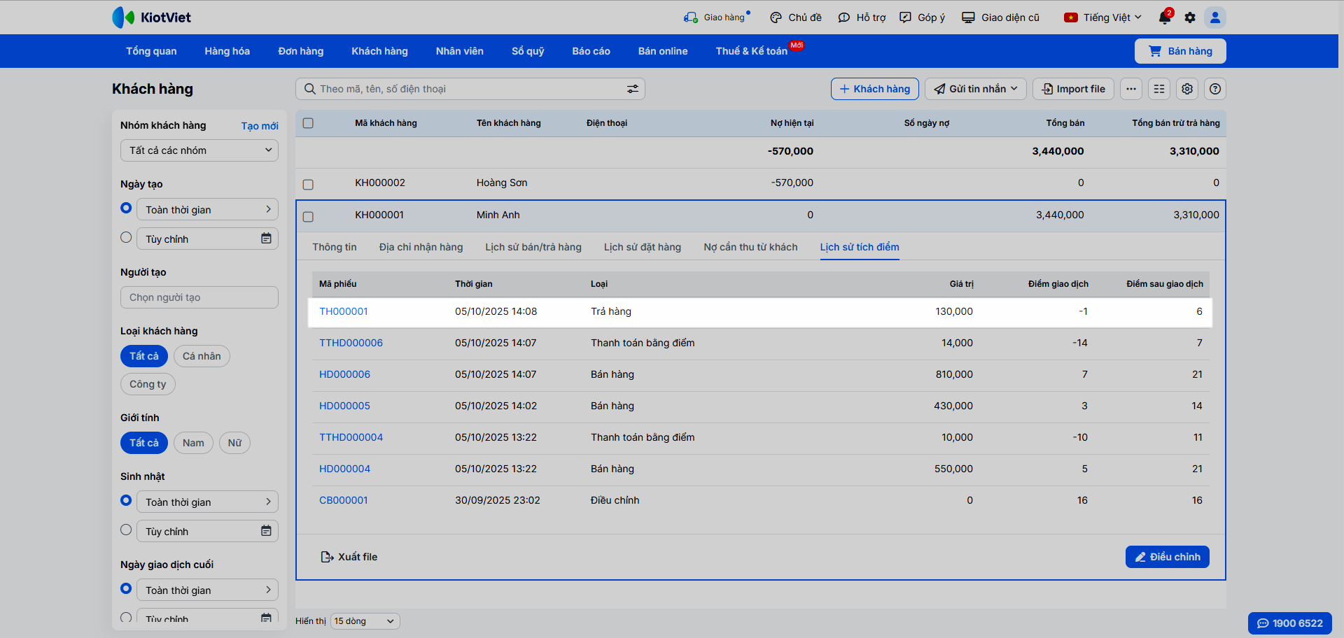 - Lưu ý: Khi khách trả lại một sản phẩm đã được tích điểm trong hóa đơn, hệ thống sẽ tự động trừ đi số điểm tương ứng đã cộng trước đó.