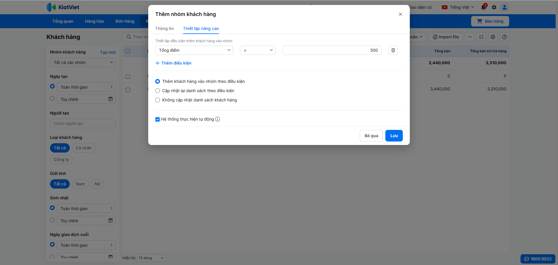 - Tình huống: Bạn muốn tạo một nhóm Khách hàng VIP tự động cho những ai có tổng điểm tích lũy trên 500 để áp dụng các chương trình ưu đãi đặc biệt.