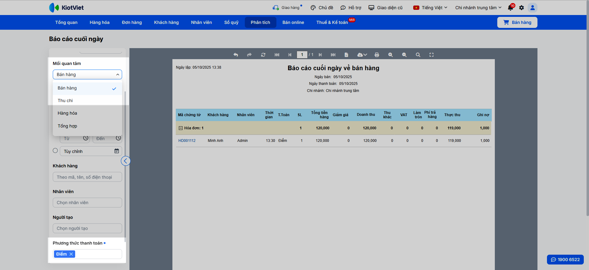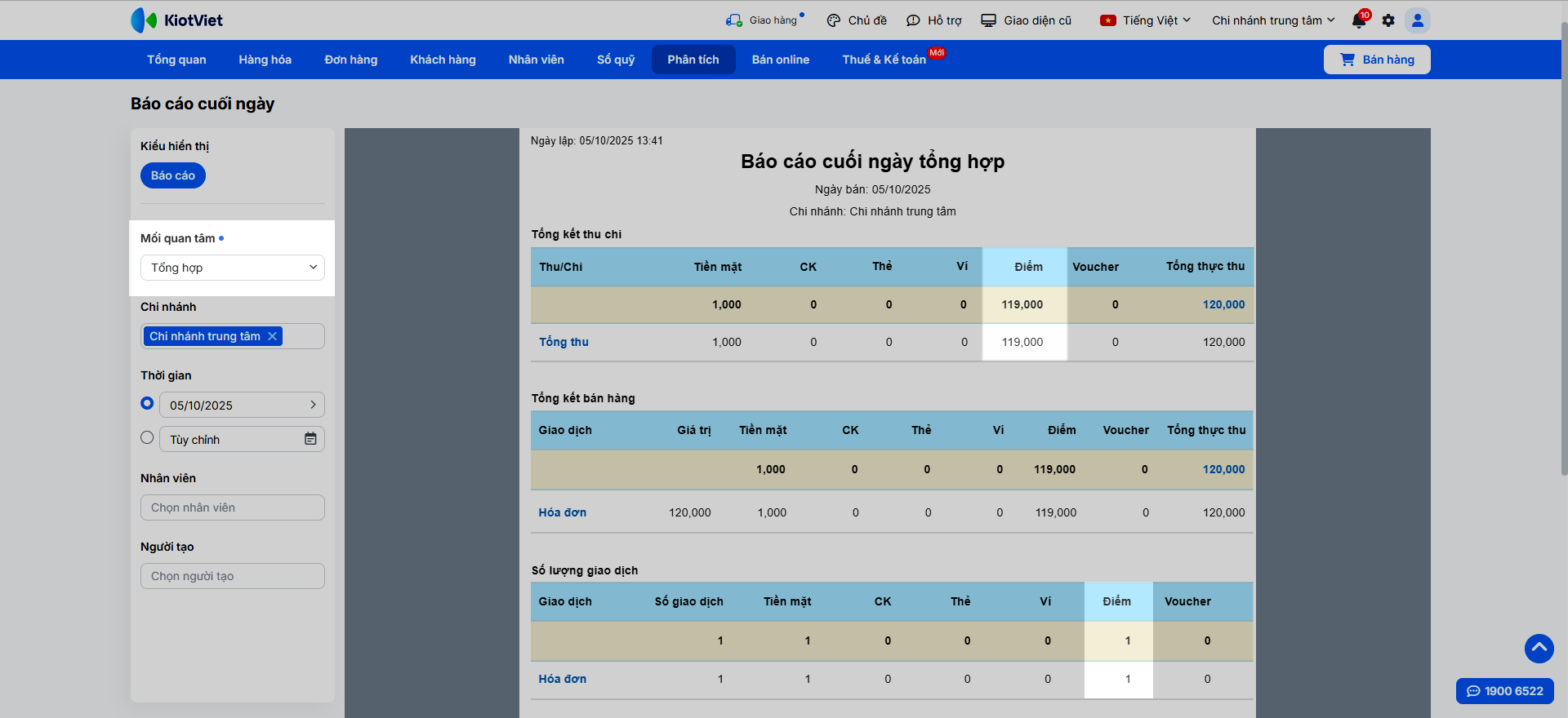 - Báo cáo cuối ngày: Bạn vào Phân tích -> Báo cáo -> Cuối ngày.