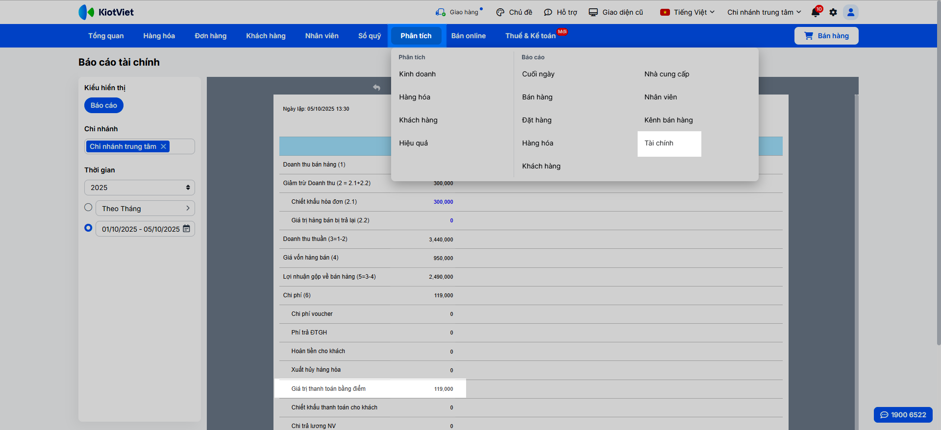 - Báo cáo tài chính: Vào Phân tích -> Báo cáo -> Tài chính. Giá trị thanh toán bằng điểm được ghi nhận vào mục Chi phí (6), phản ánh khoản chi của cửa hàng cho hoạt động này.