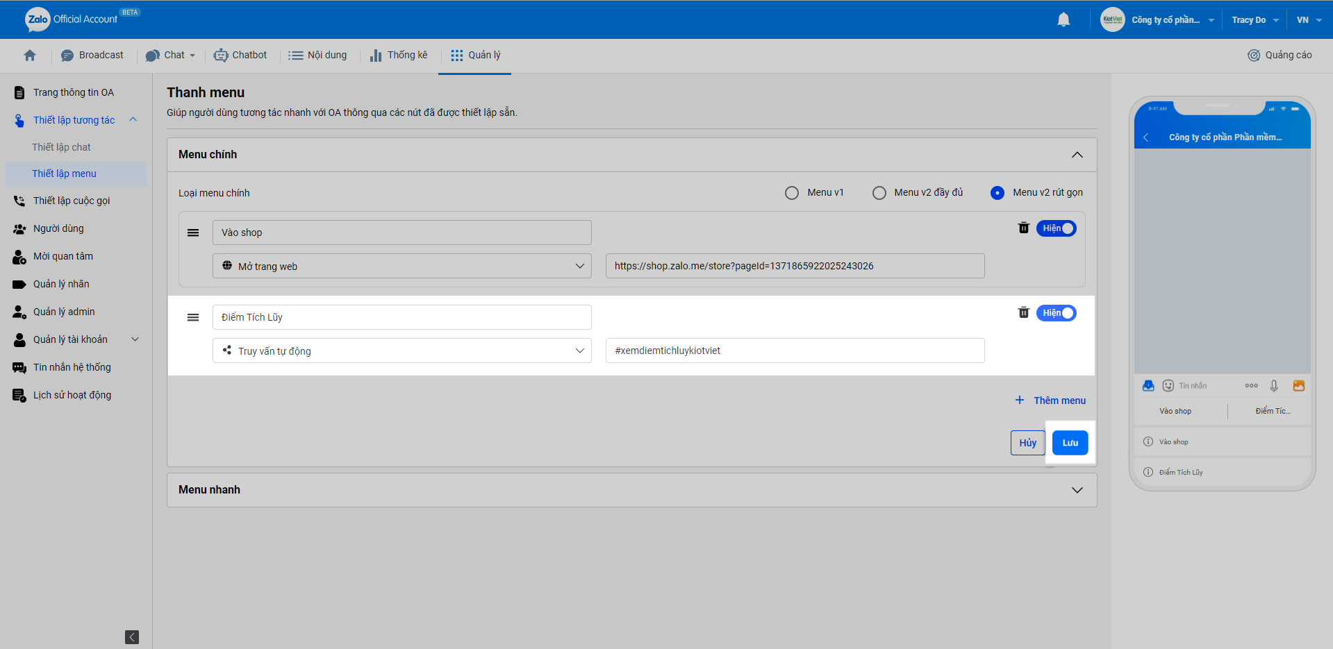 - Trên trang quản trị Zalo Official Account (ZOA) của cửa hàng, bạn vào Thiết lập tương tác -> Thiết lập menu.