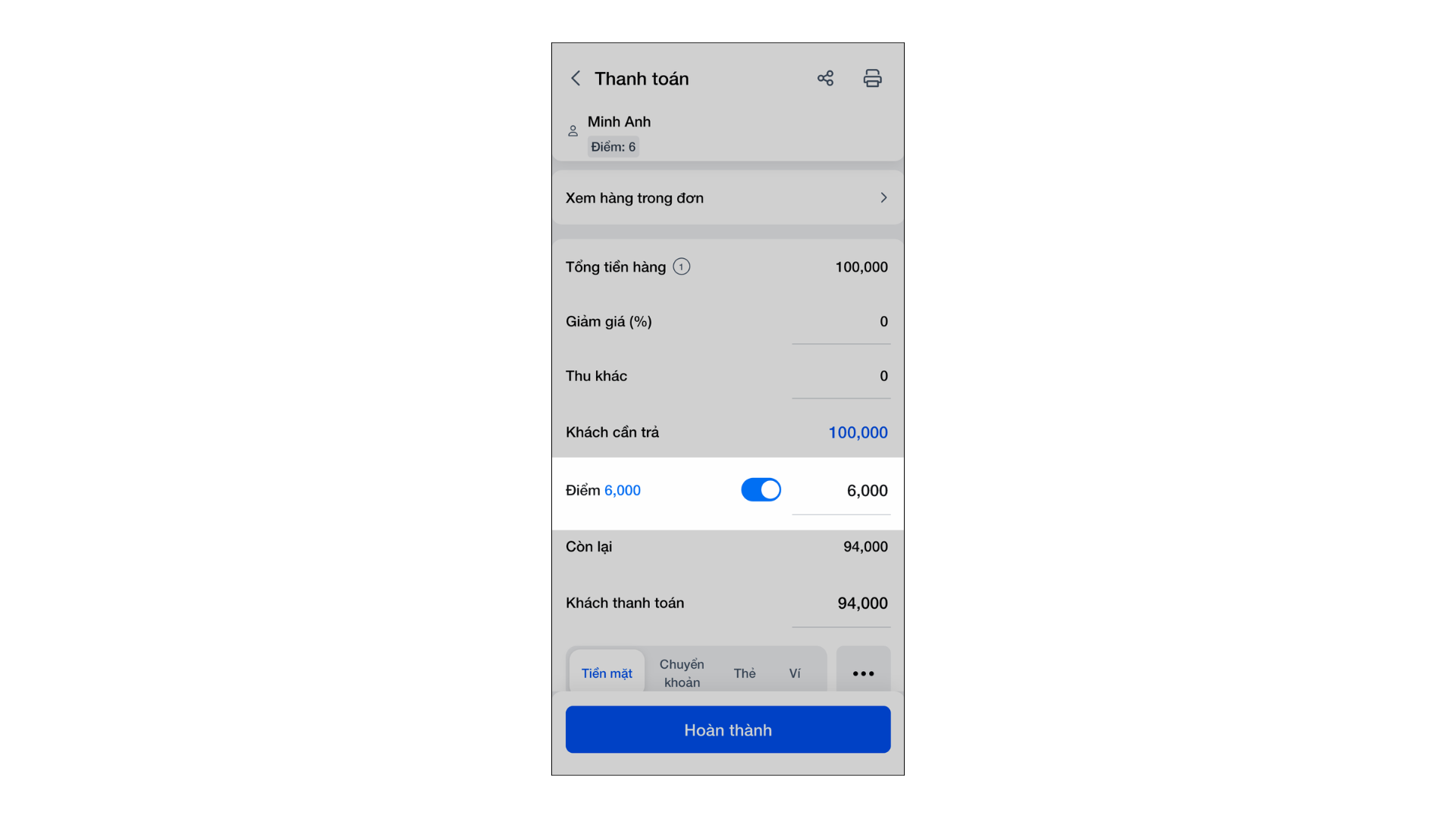 Tương tự phiên bản máy tính, ứng dụng sẽ hiển thị số điểm hiện có của khách. Để thanh toán, bạn bật xanh Điểm và nhập số tiền muốn quy đổi (không vượt quá tổng tiền khách phải trả).
