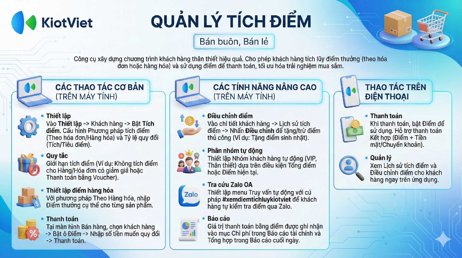 Tính năng Tích điểm là công cụ giúp cửa hàng xây dựng các chương trình khách hàng thân thiết, cho phép khách hàng tích lũy điểm thưởng sau mỗi lần mua sắm và sử dụng điểm để thanh toán hoặc hưởng các ưu đãi đặc biệt. KiotViet hỗ trợ hai hình thức tích điểm linh hoạt: theo tổng giá trị hóa đơn hoặc theo từng hàng hóa cụ thể.