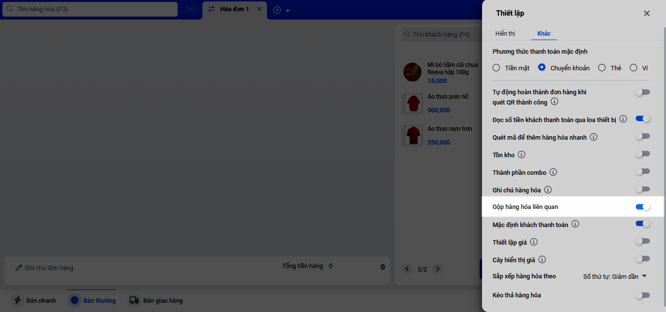 → chọn Tùy chọn hiển thị → Khác → bật xanh Gộp hàng hóa liên quan.