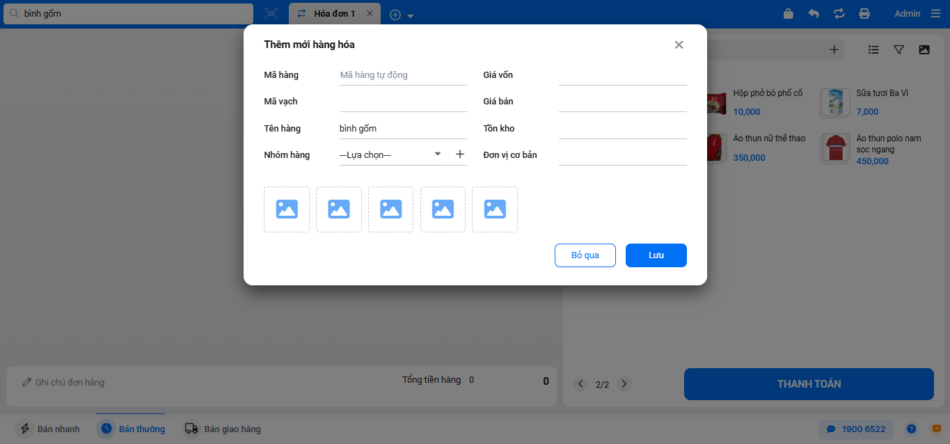 - Nhấp vào đó, điền thông tin sản phẩm mới và lưu lại. Sản phẩm sẽ được thêm vào hóa đơn và danh mục hàng hóa của cửa hàng.