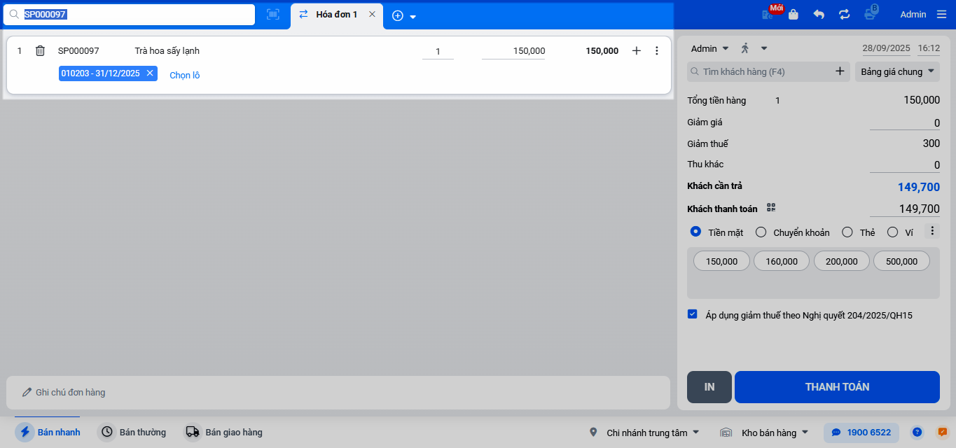 - Khi bạn tìm và chọn một hàng hóa được quản lý theo lô, hệ thống sẽ tự động gợi ý lô có hạn sử dụng gần nhất để xuất bán trước (theo nguyên tắc FEFO – First Expired, First Out).