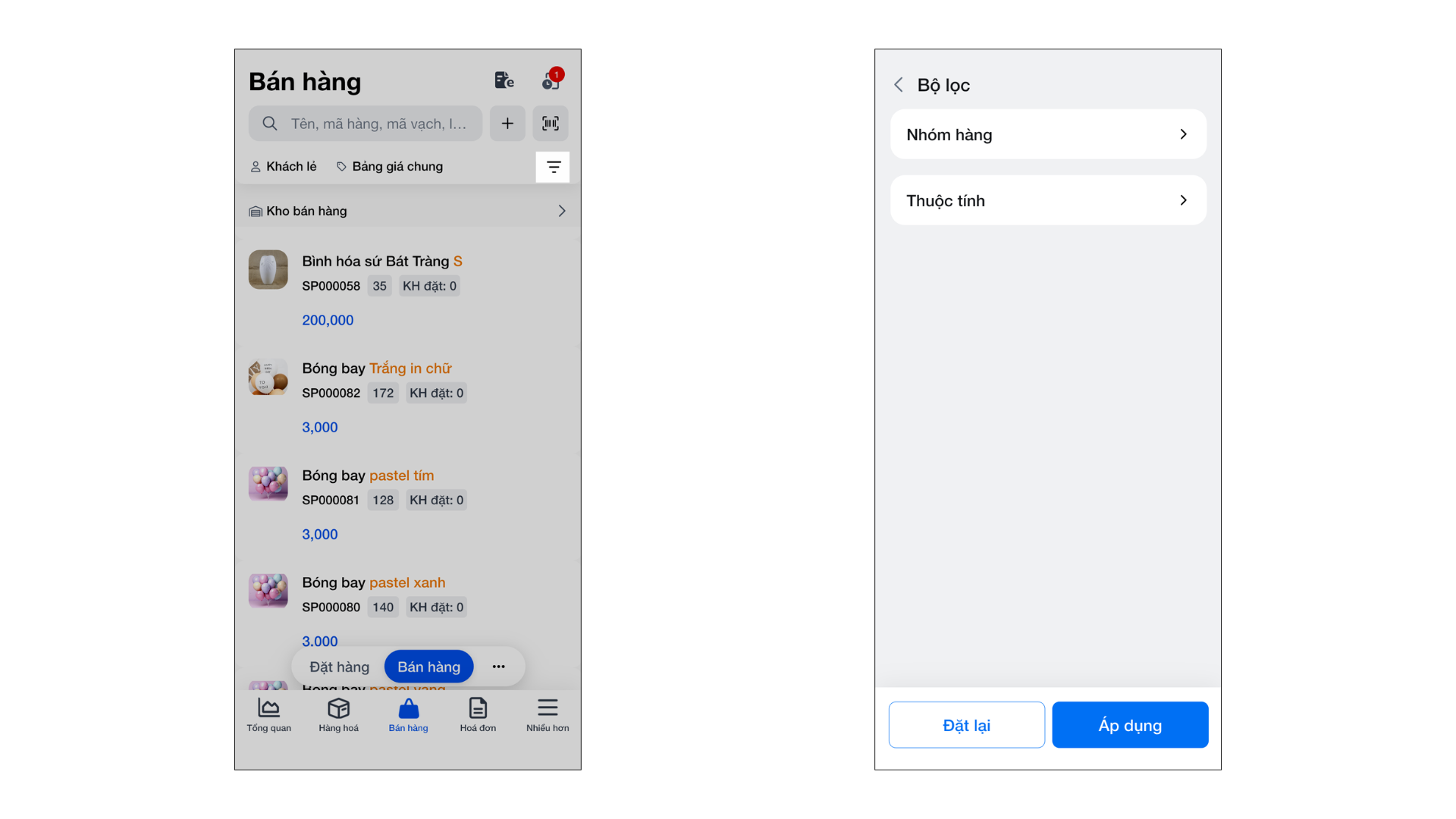 - Lọc: Chạm vào tùy chọn để lọc theo Nhóm hàng hoặc Thuộc tính.