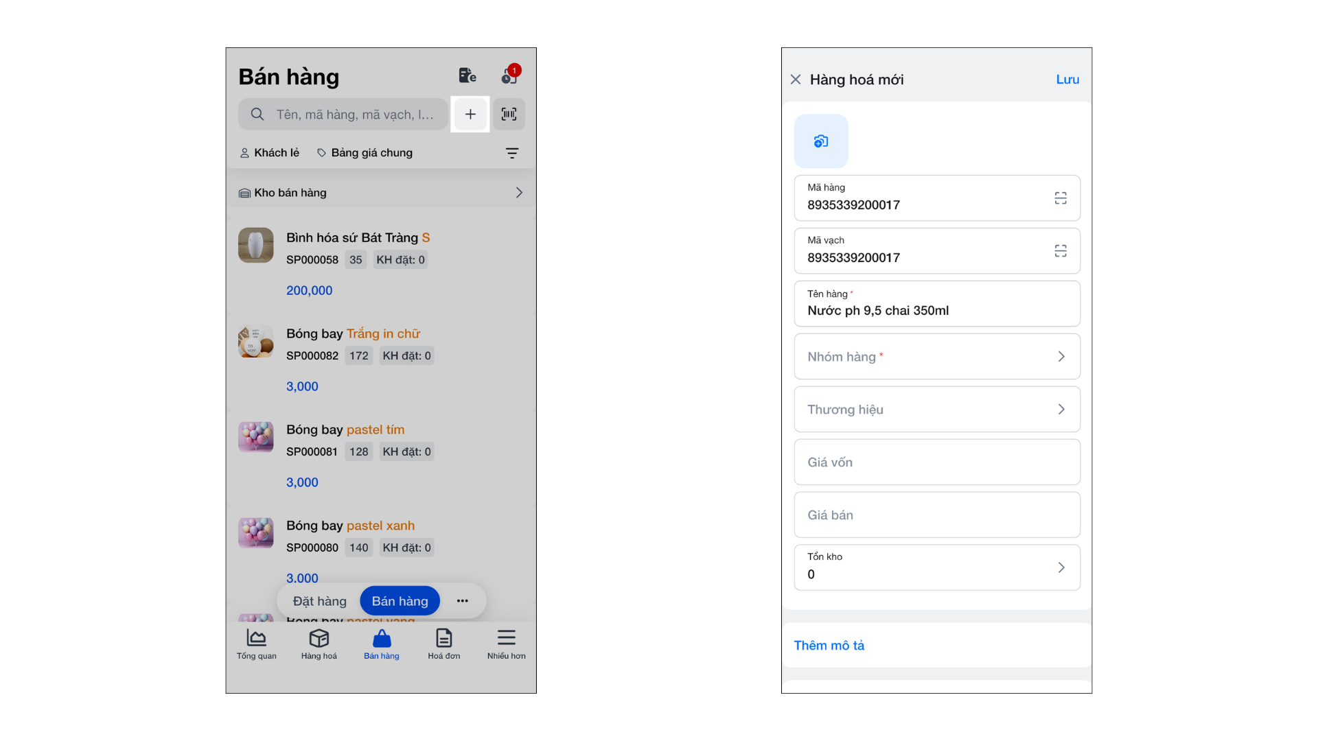 - Thêm mới hàng hóa: Chạm vào biểu tượng dấu cộng để thêm hàng hóa mới ngay khi bán hàng.