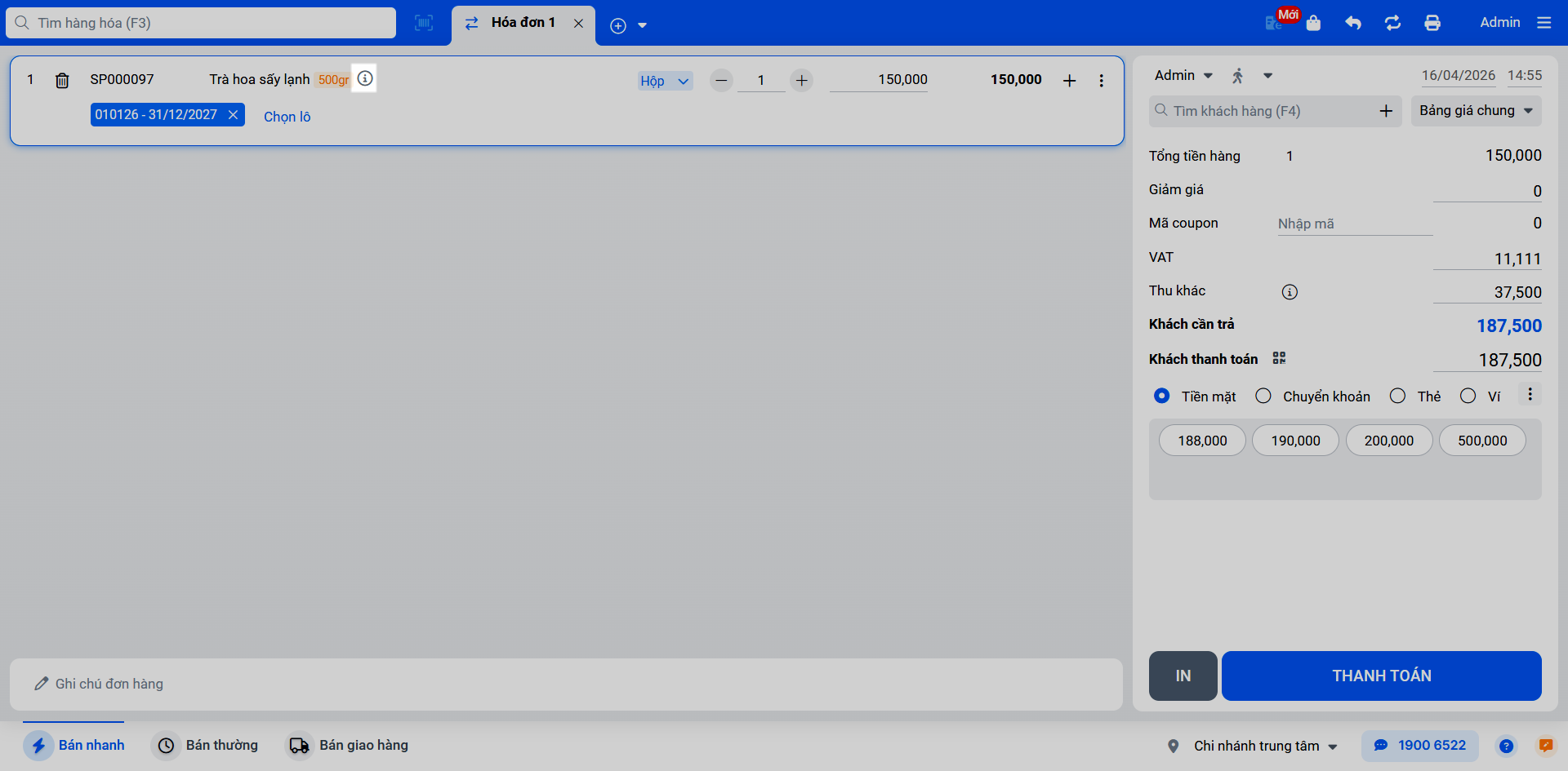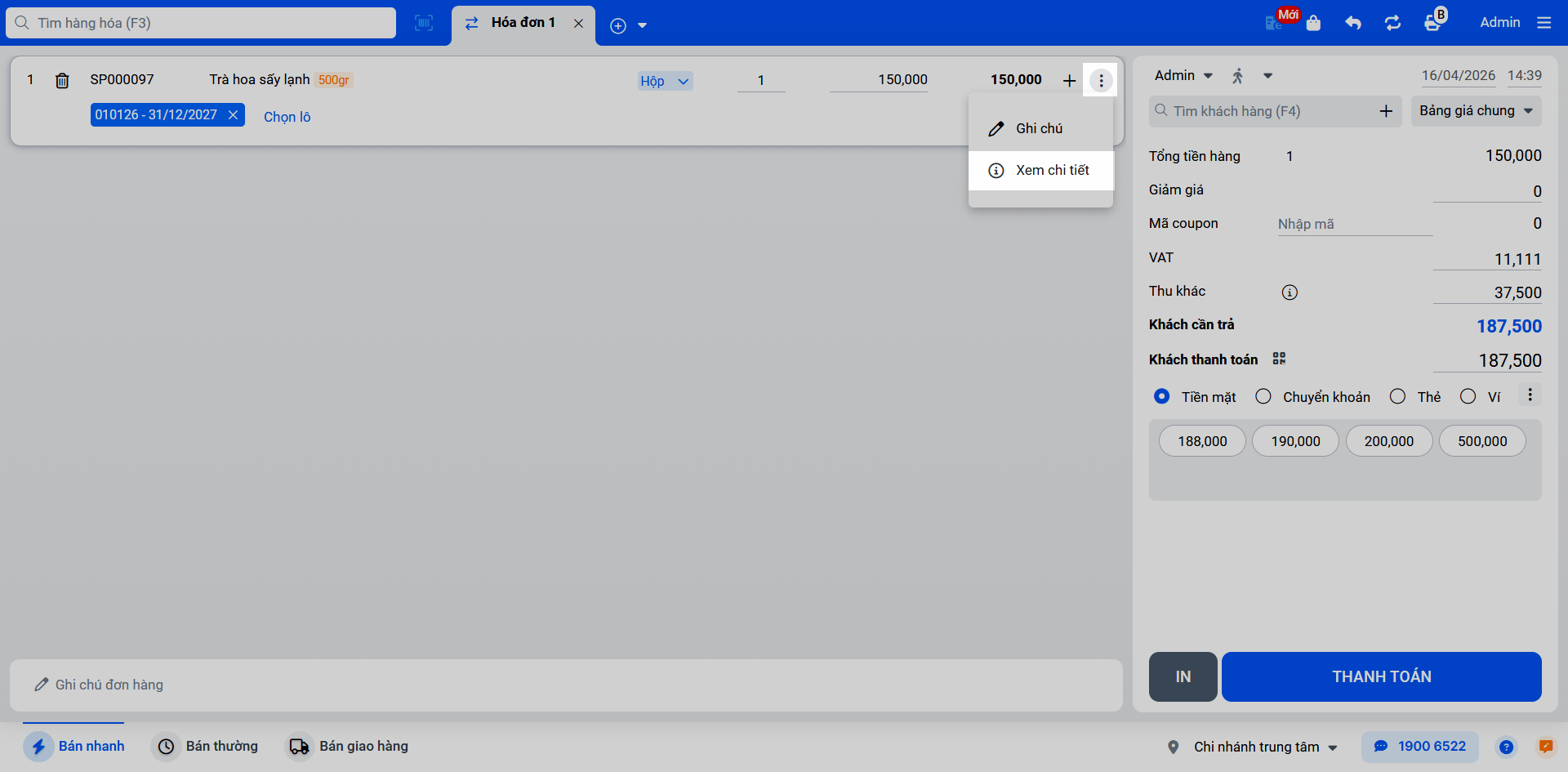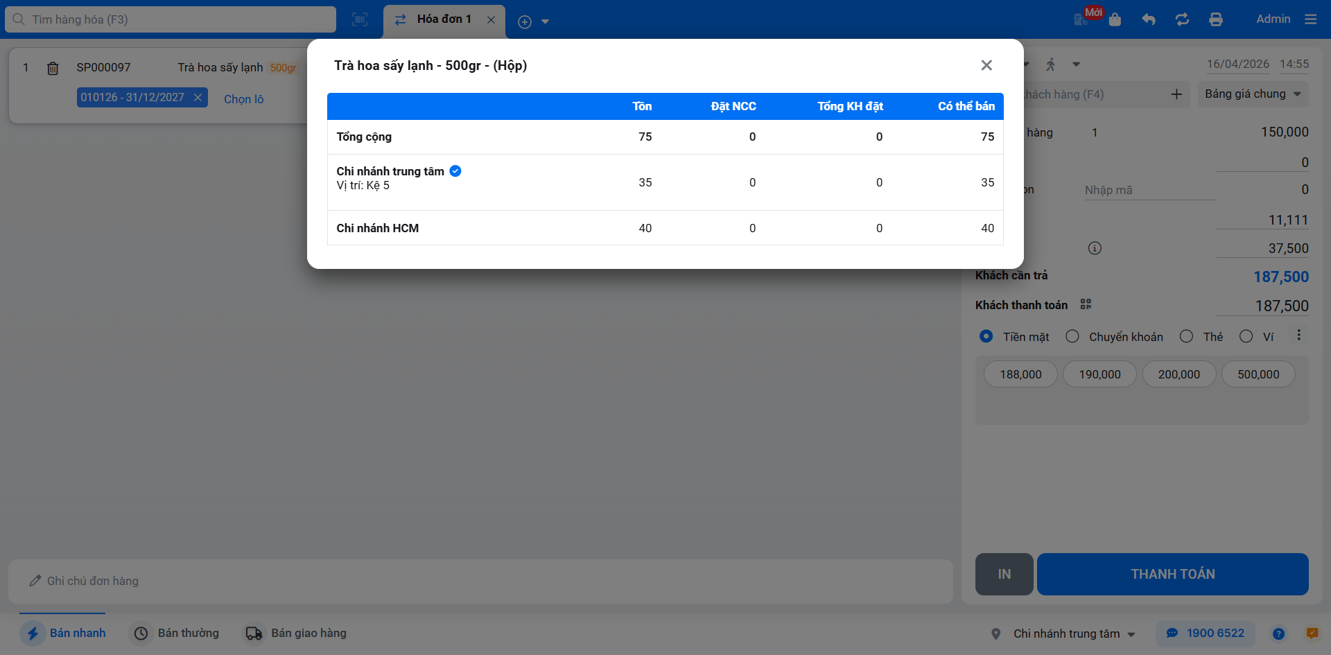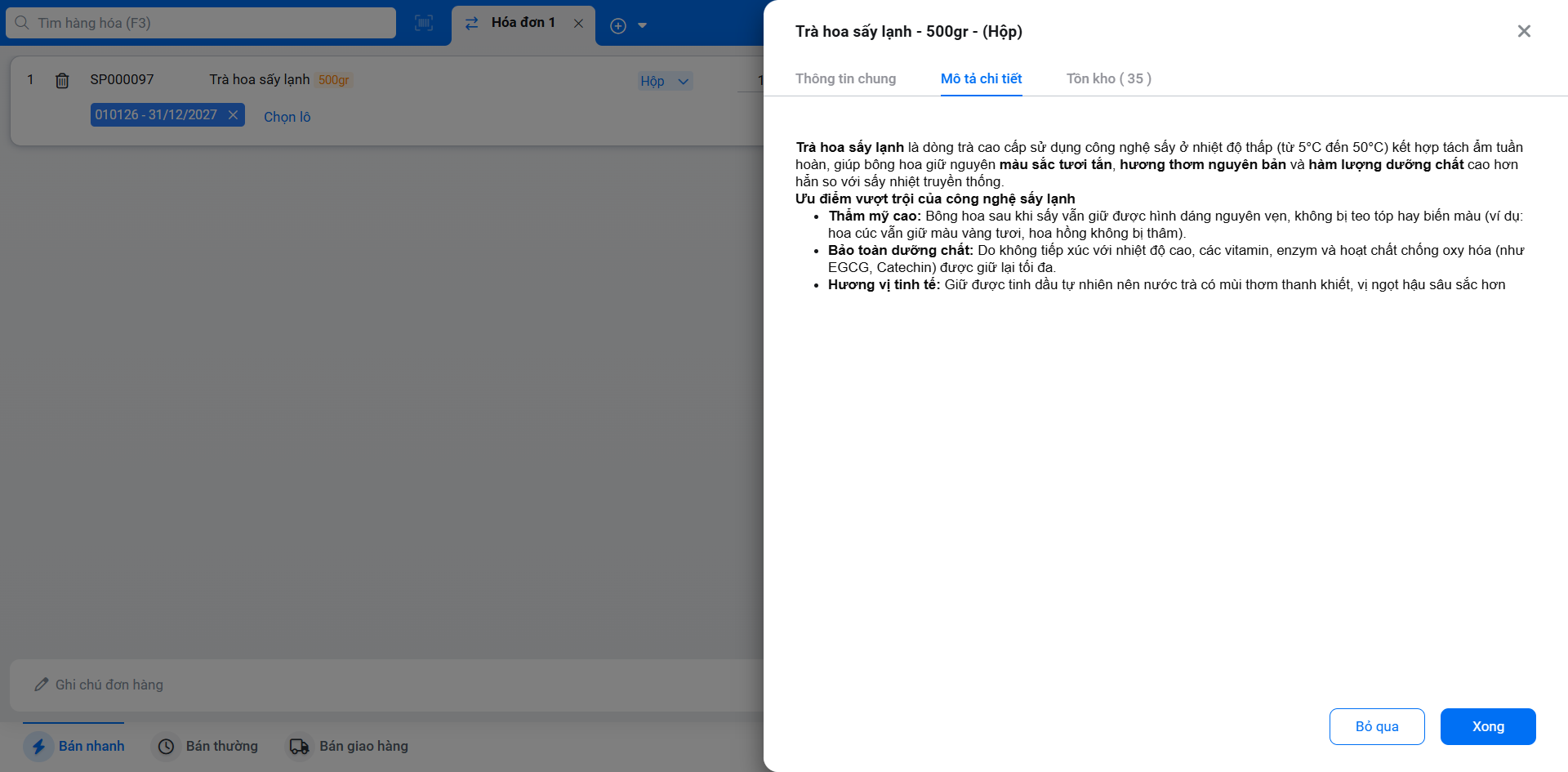 - Khi bạn tìm và chọn một hàng hóa được quản lý theo lô, hệ thống sẽ tự động gợi ý lô có hạn sử dụng gần nhất để xuất bán trước (theo nguyên tắc FEFO – First Expired, First Out).