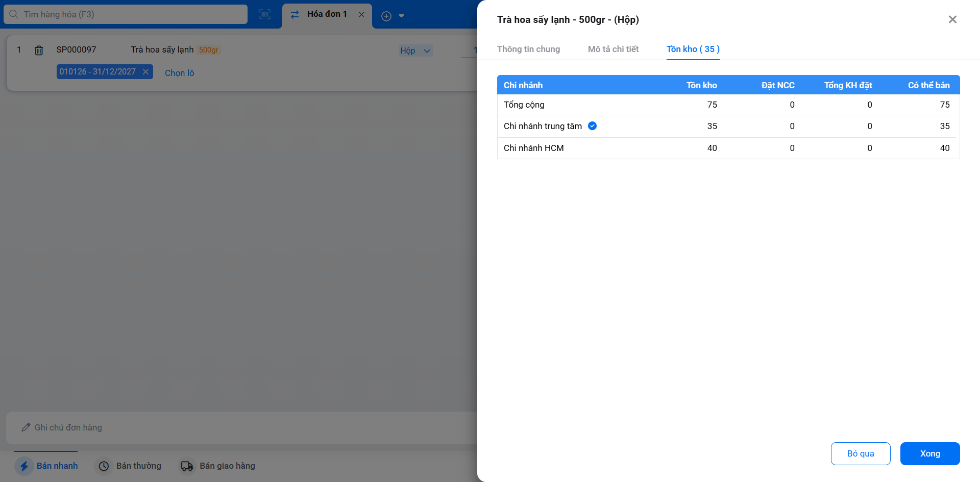 - Hệ thống sẽ hiển thị cửa sổ thông tin đầy đủ bao gồm: Giá bán, Tồn kho, Thương hiệu, Vị trí, Hàng cùng loại , Lô – HSD/ IMEI, Mô tả chi tiết, Tồn kho từng chi nhánh giúp bạn dễ dàng lấy hàng hoặc tư vấn cho khách.