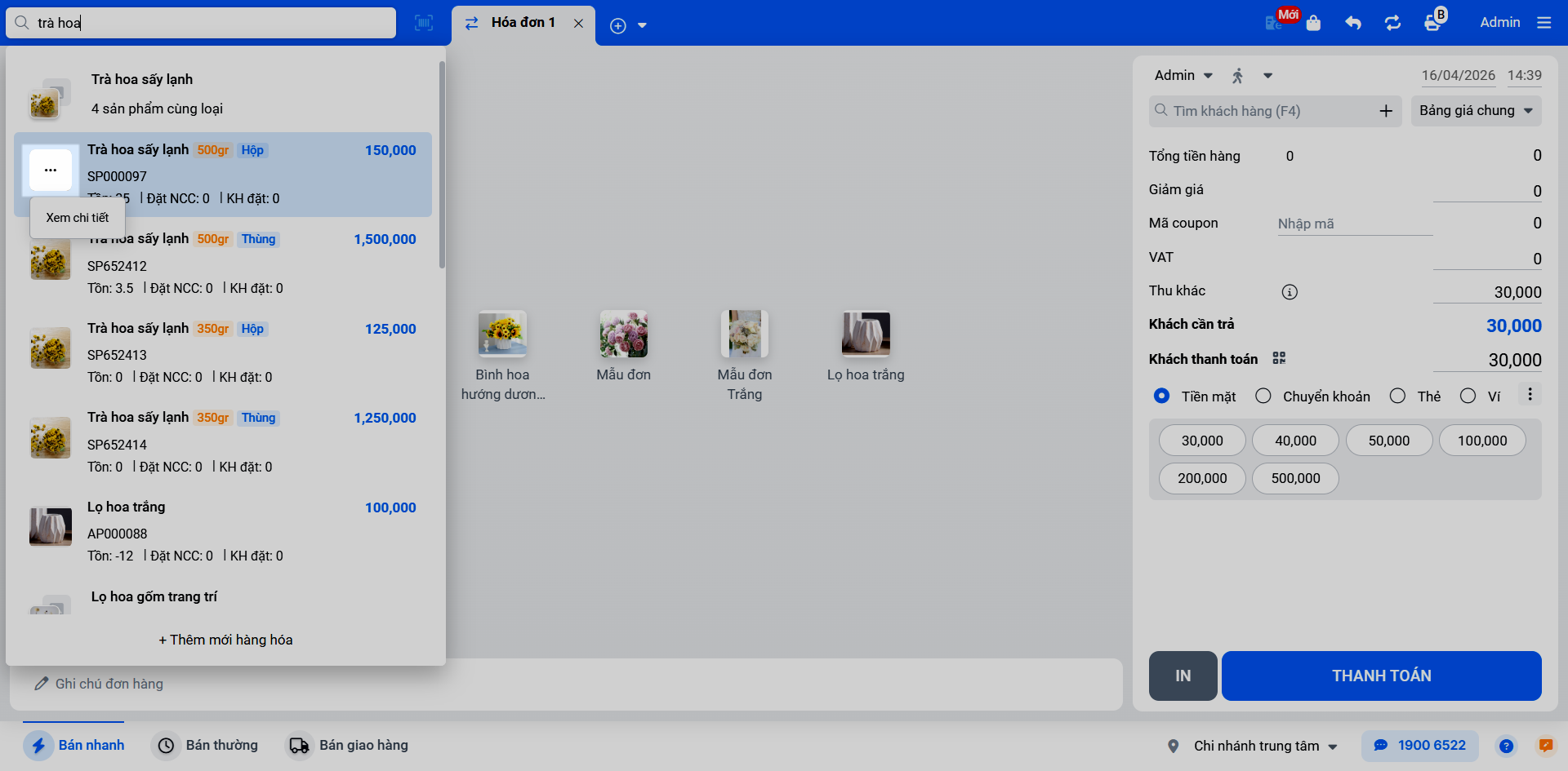 - Tình huống: Bạn cần tìm sản phẩm và thêm vào hóa đơn khi thanh toán tại quầy trên máy POS.
