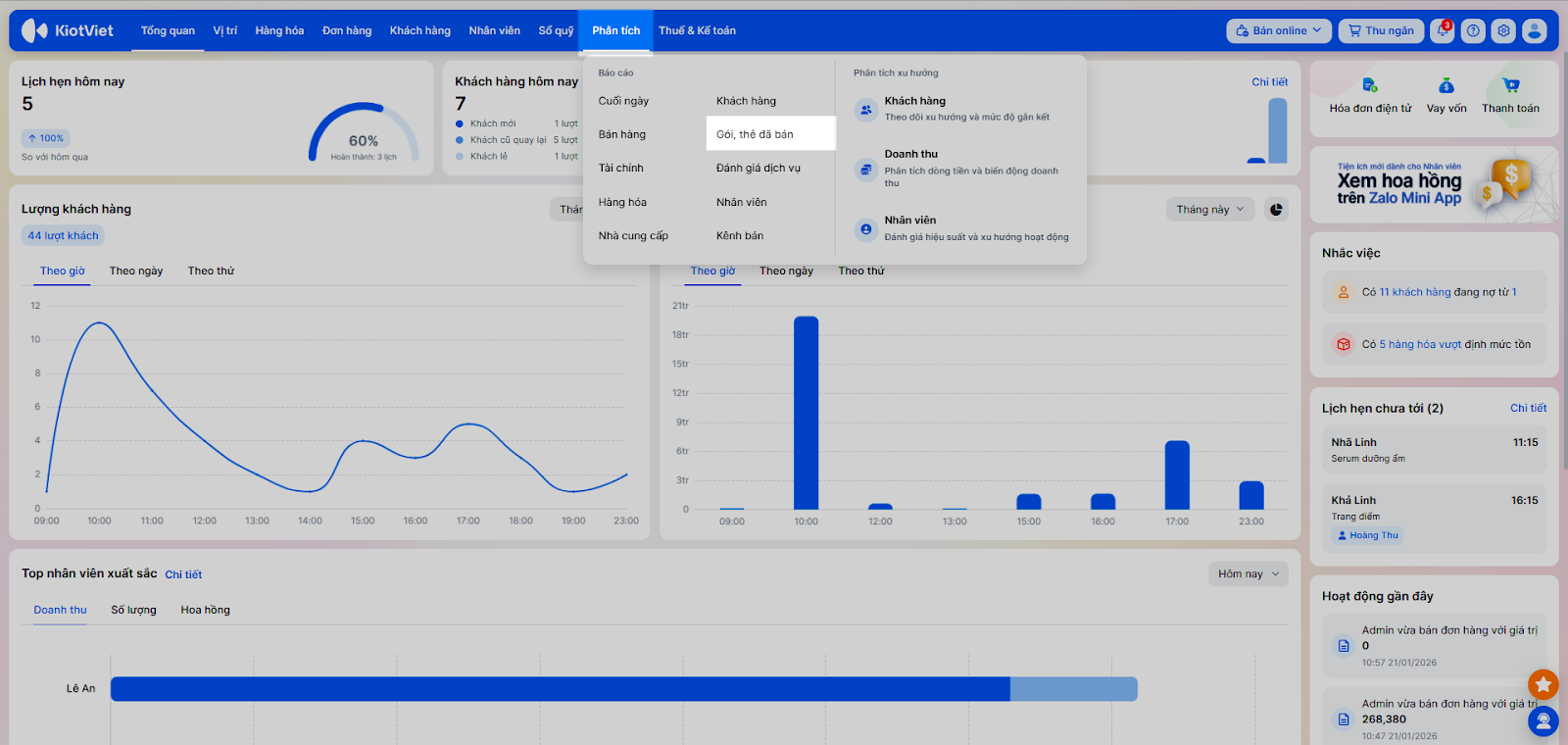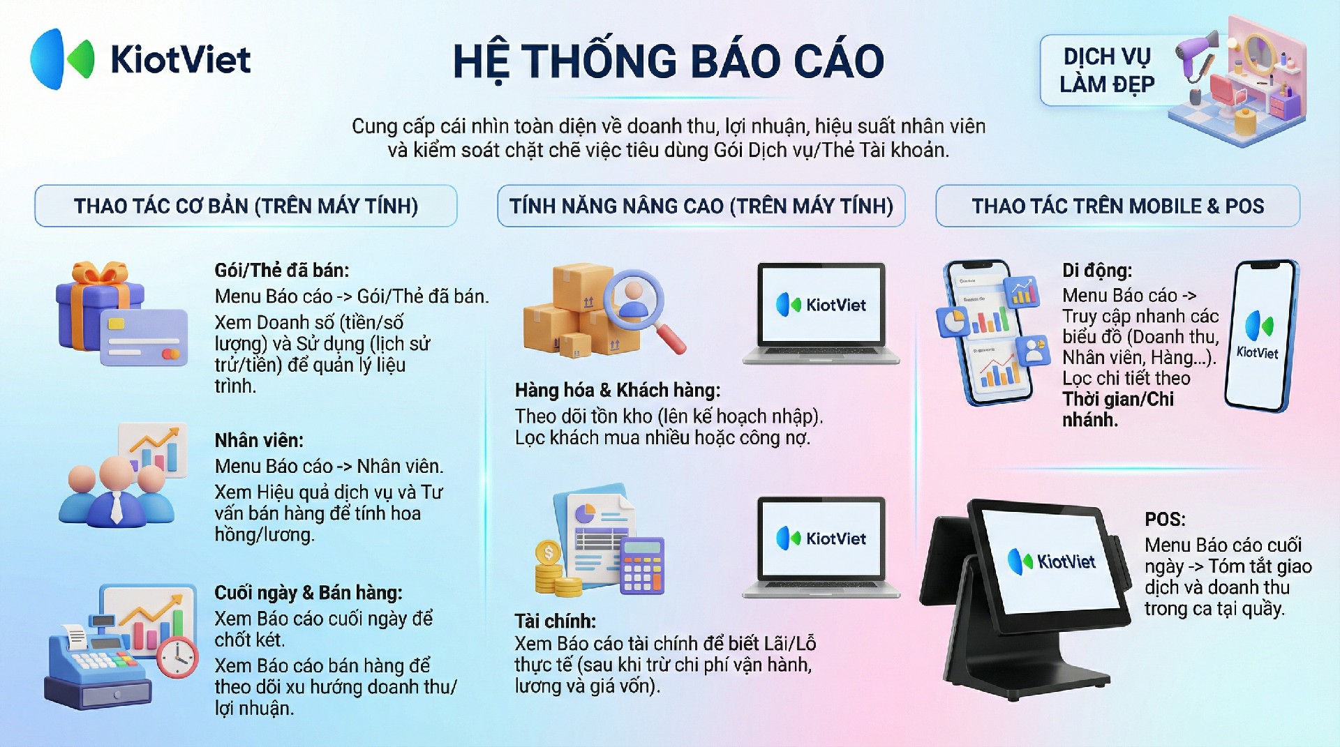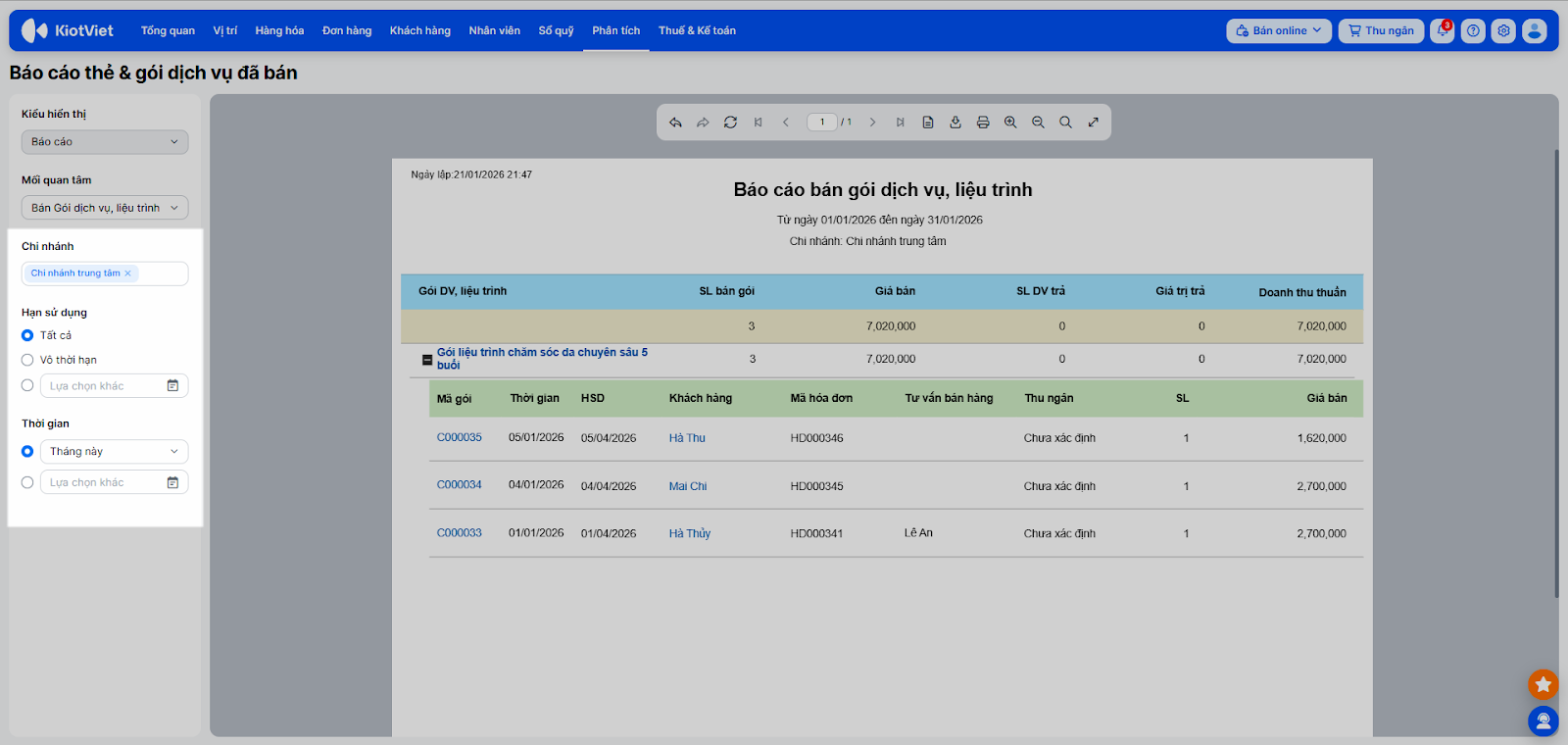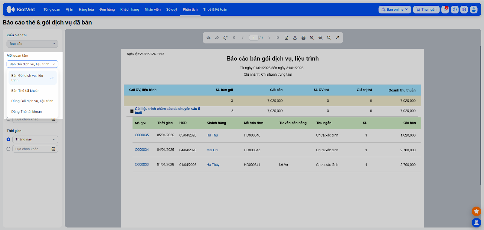 - Bán Gói dịch vụ, liệu trình/ Bán Thẻ tài khoản: Xem số lượng gói/thẻ đã bán, doanh thu thu được và giá trị còn lại.