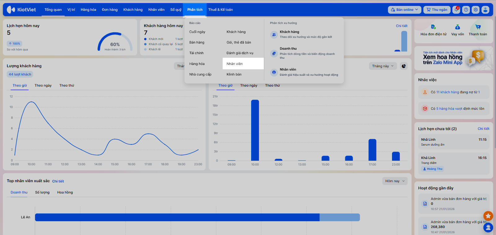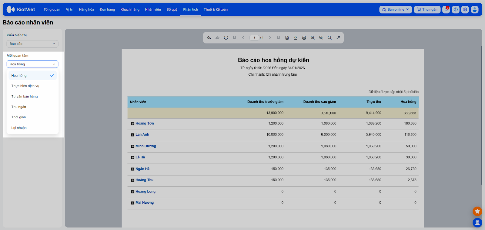 - Bạn chọn Phân tích/Báo cáo → Nhân viên.