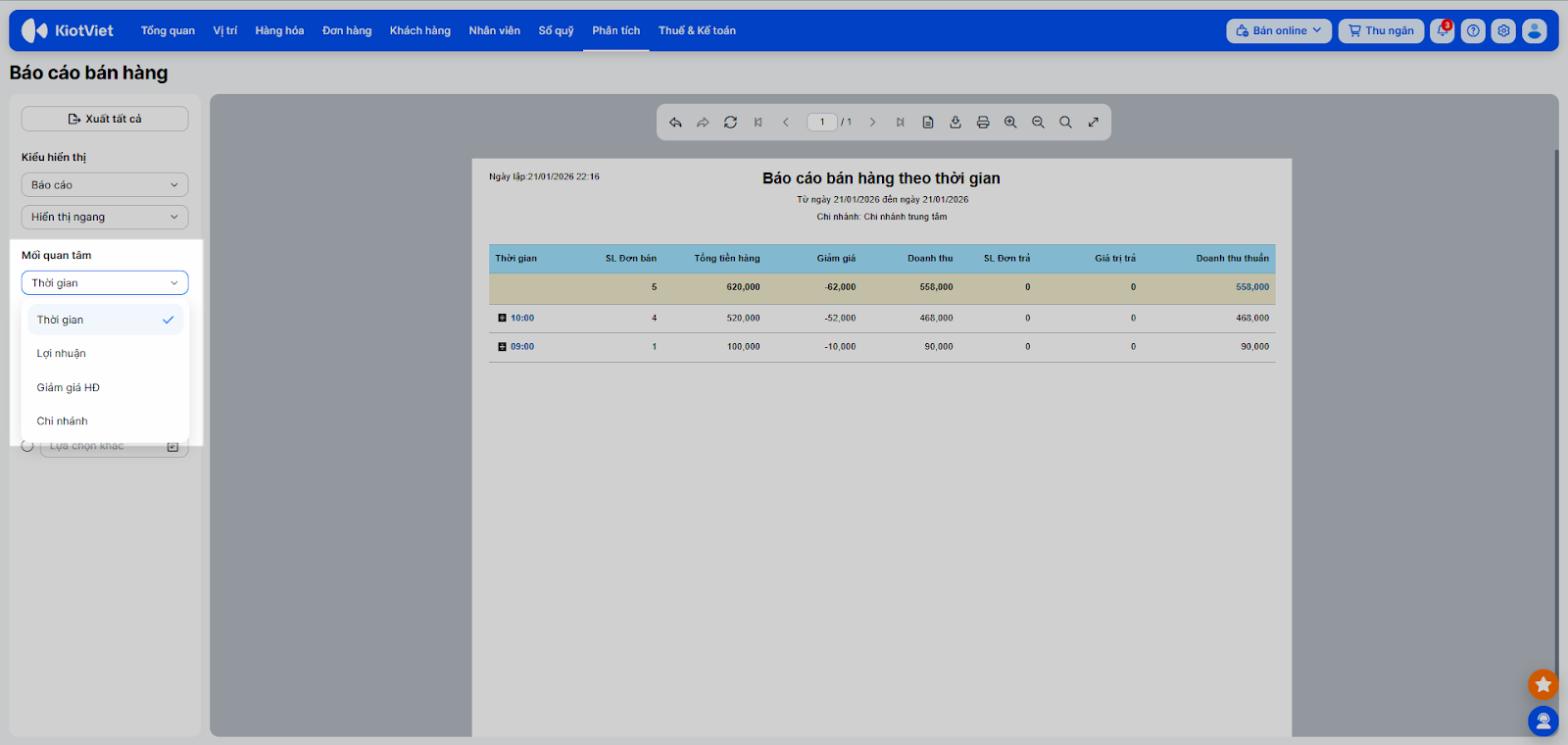 - Chọn Mối quan tâm: Thời gian/ Lợi nhuận/ Giảm giá HĐ/ Chi nhánh và sử dụng bộ lọc bên trái màn hình để xem chi tiết.
