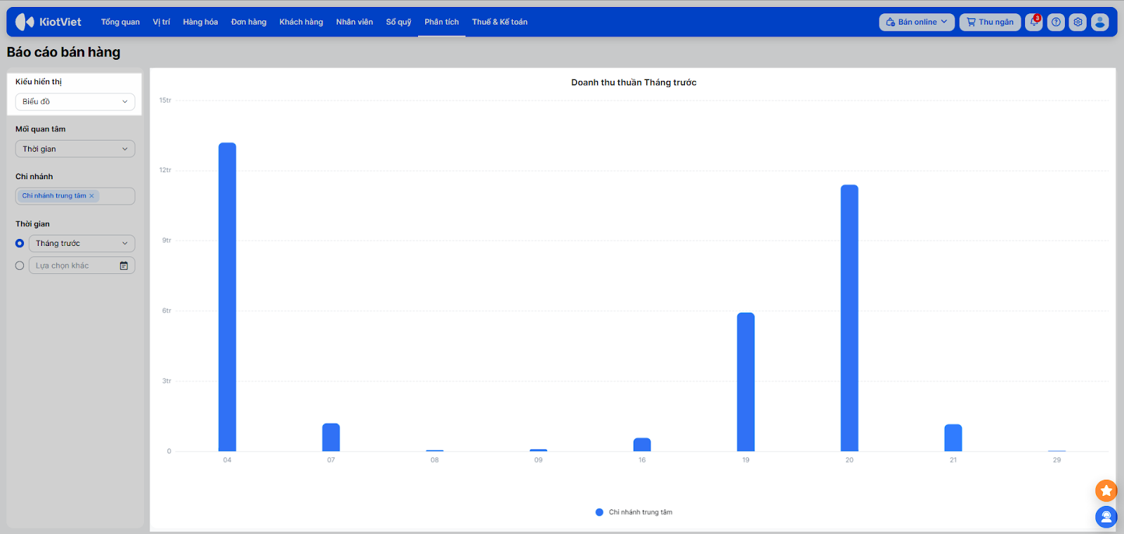 - Sử dụng bộ lọc Thời gian (Hôm nay, Tuần này, Tháng này…) và Chi nhánh ở phía trên màn hình để lọc dữ liệu cần xem.