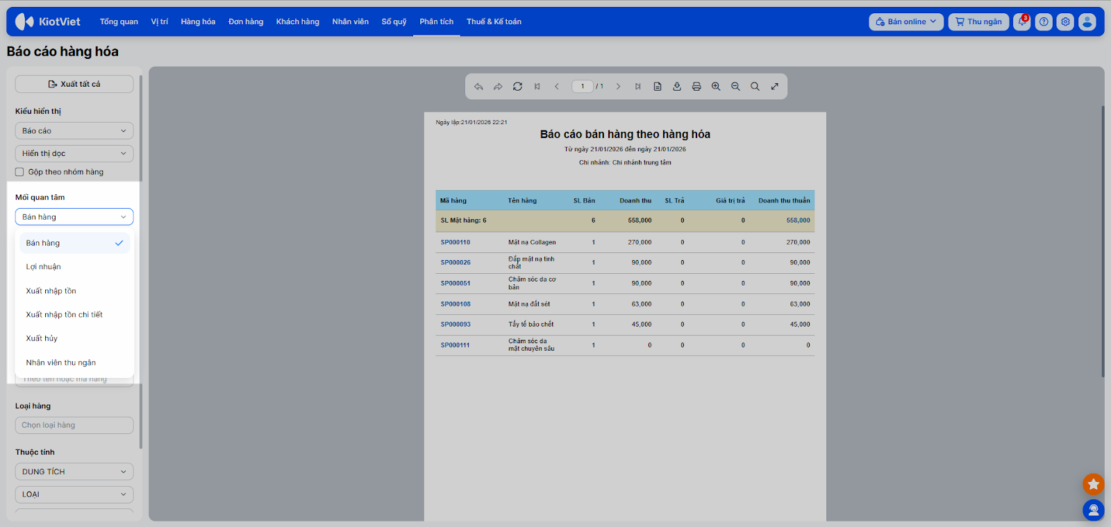 - Bạn chọn Phân tích/Báo cáo → Hàng hóa.