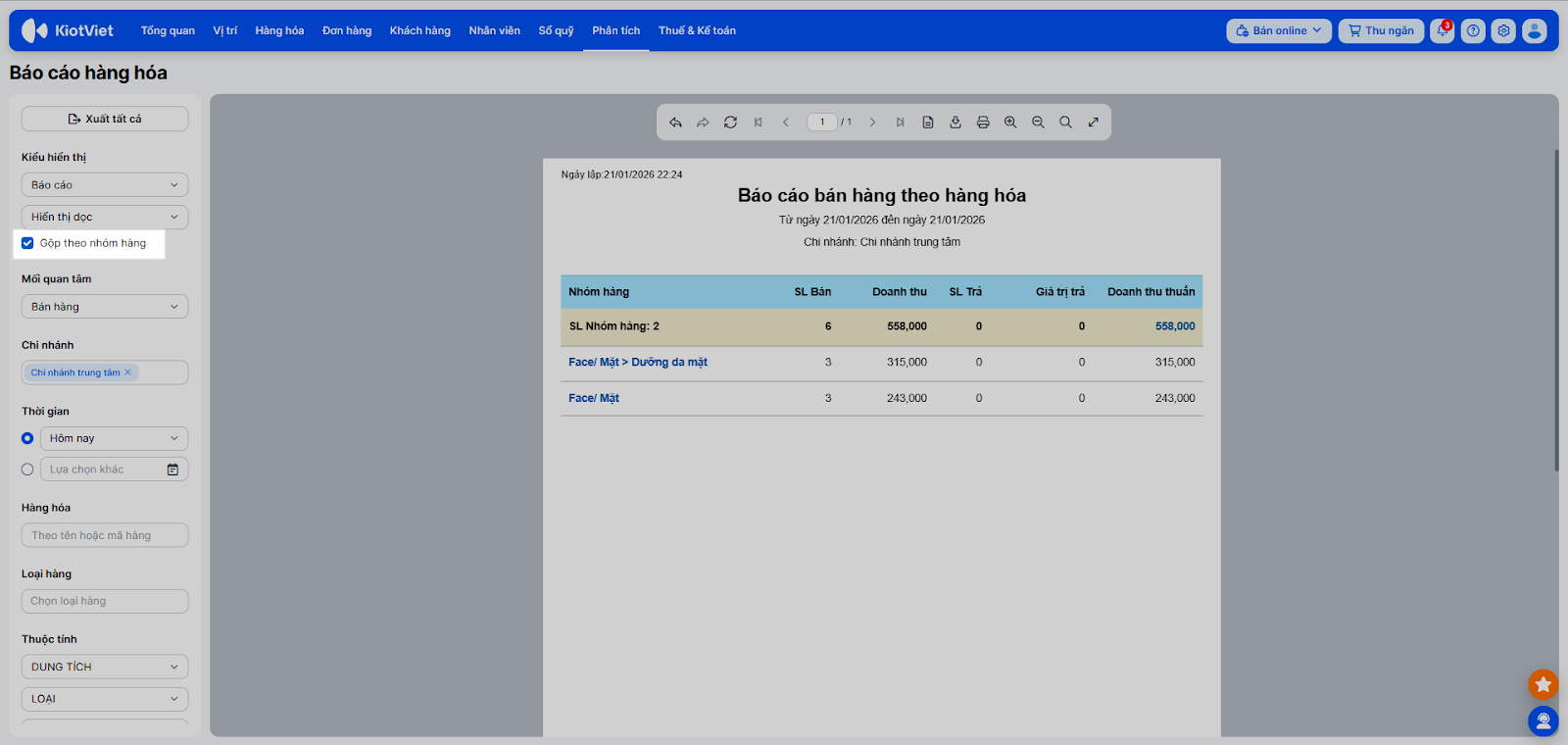 - Tích chọn Gộp theo nhóm hàng để quản lý dễ dàng hơn (ví dụ: Nhóm Dầu gội, Nhóm Hóa chất).
