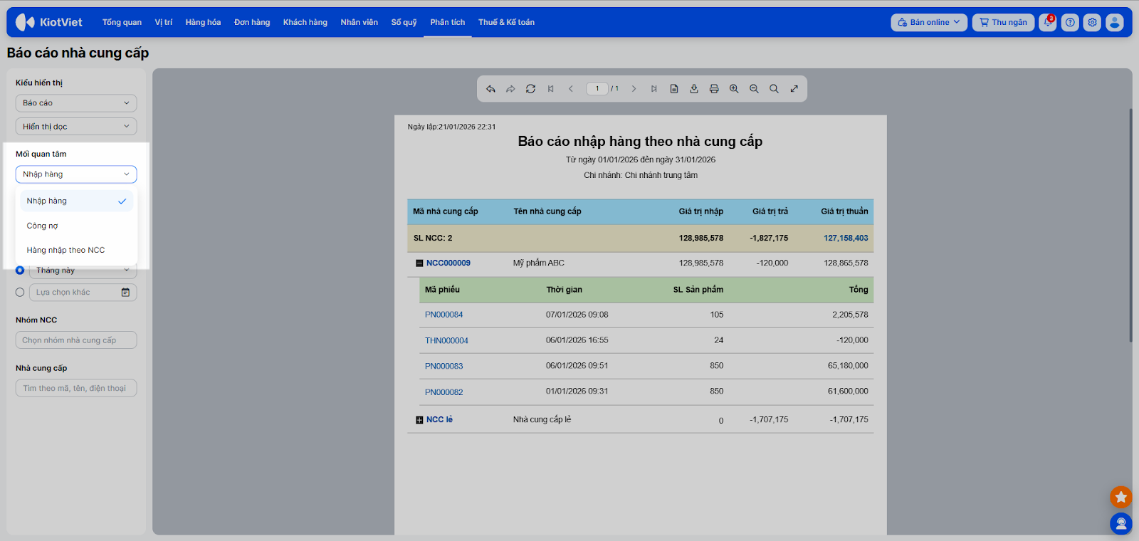 - Chọn Mối quan tâm: Nhập hàng/ Công nợ/ Hàng nhập theo NCC và sử dụng bộ lọc bên trái màn hình để xem chi tiết.