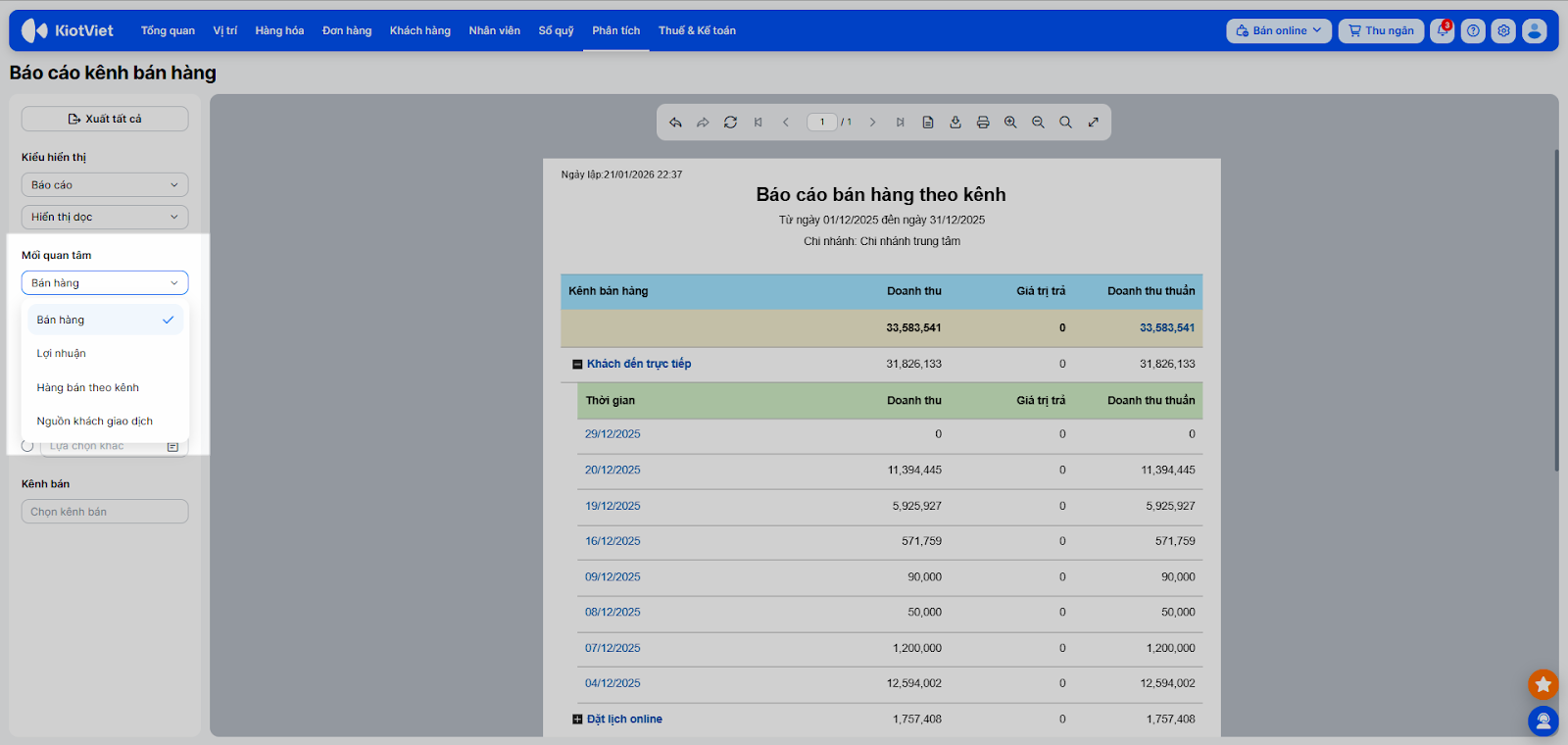 - Chọn Mối quan tâm: Bán hàng/ Lợi nhuận/ Hàng bán theo kênh/ Nguồn khách giao dịch và sử dụng bộ lọc bên trái màn hình để xem chi tiết.