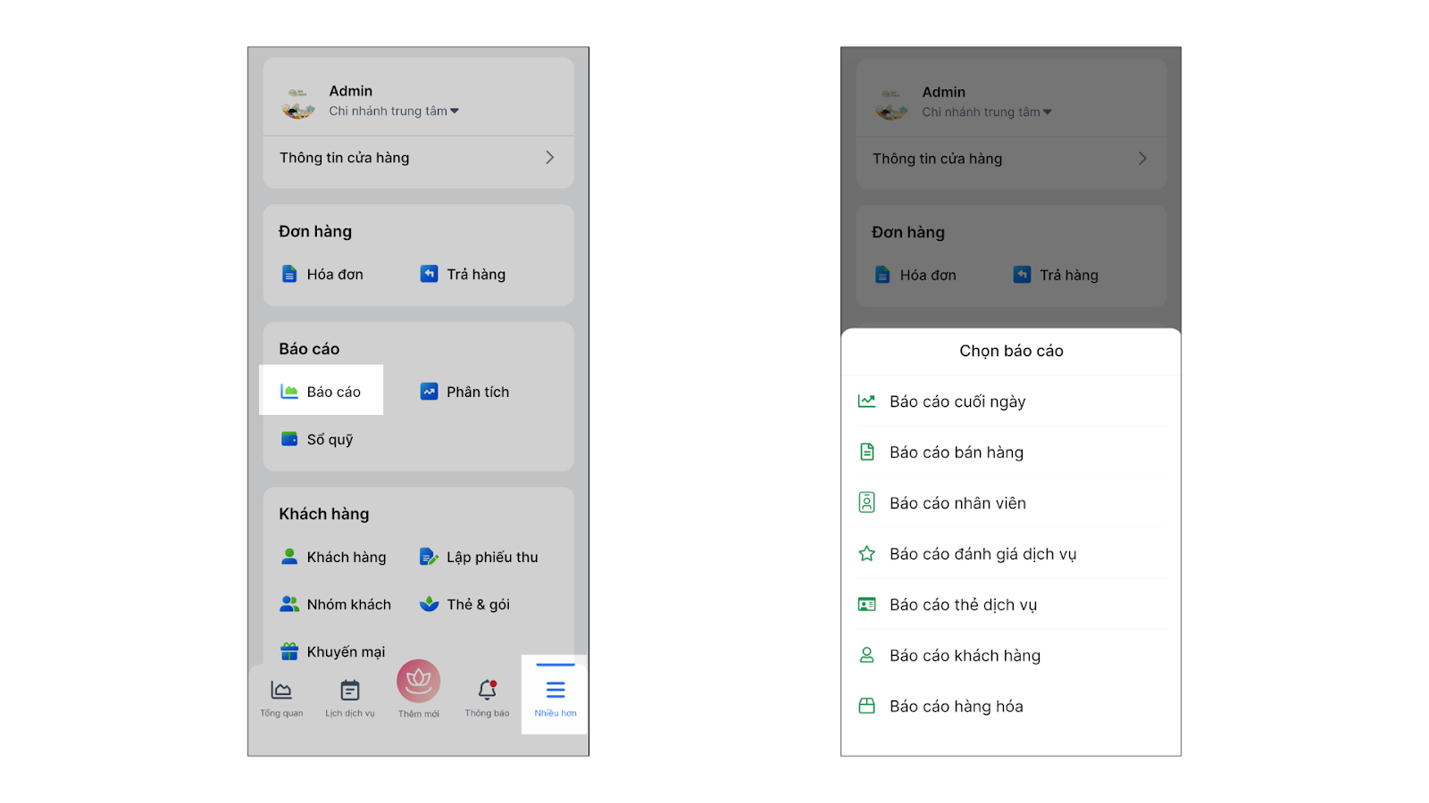 - Trên ứng dụng KiotViet Salon, bạn vào menu Nhiều hơn → Báo cáo.