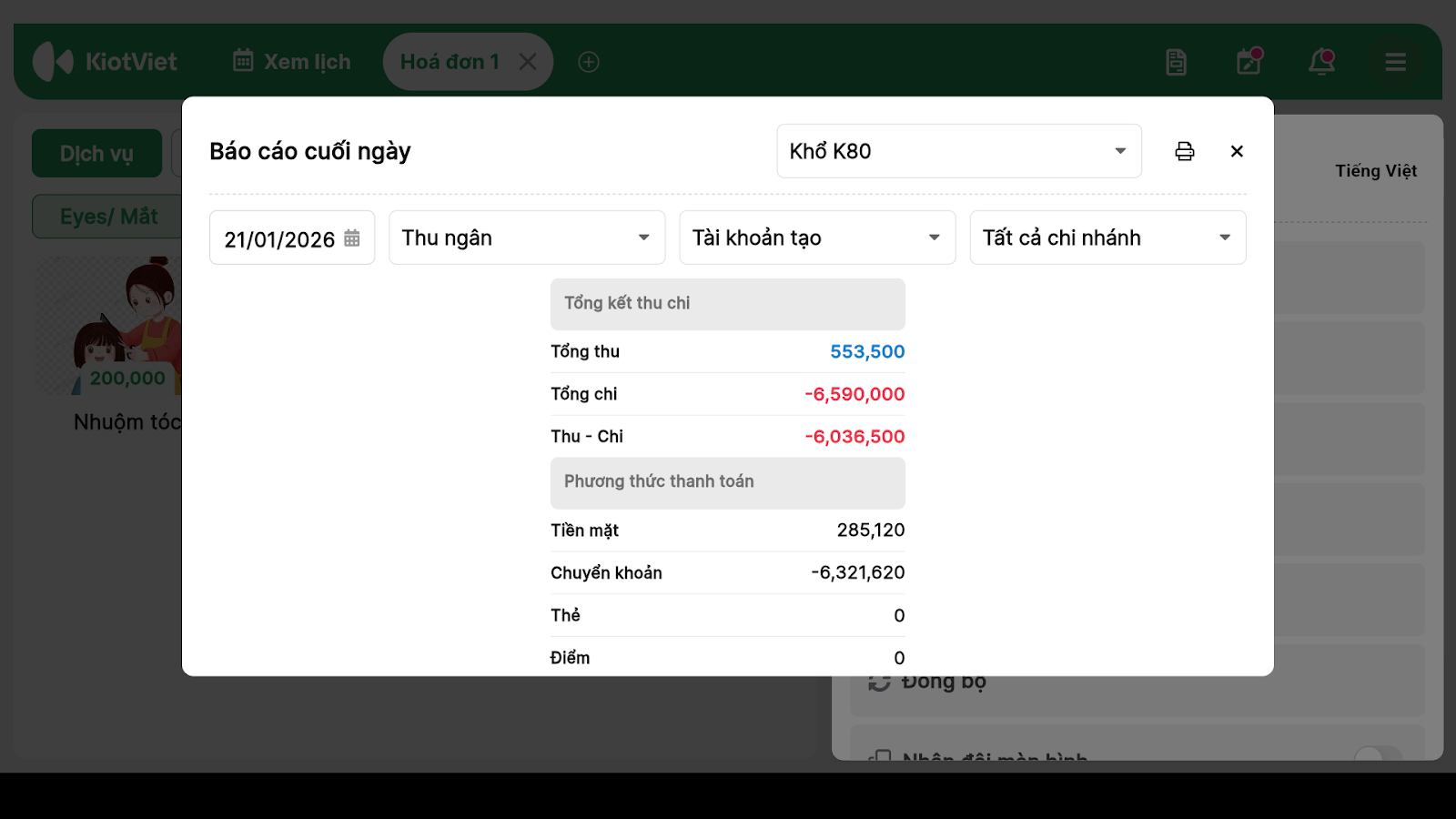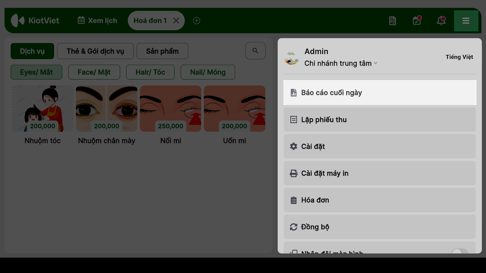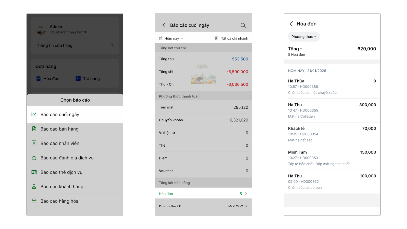 - Tình huống: Kết thúc ca làm việc buổi tối, bạn muốn kiểm tra nhanh tổng số tiền mặt thu được từ dịch vụ làm đẹp và bán mỹ phẩm trong ngày để bàn giao ca hoặc chốt sổ.